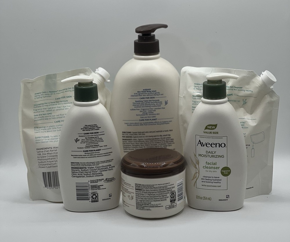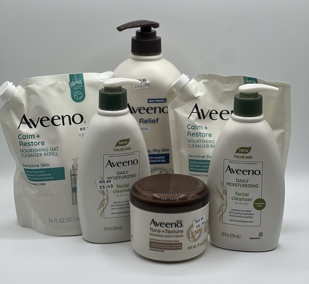 Aveeno Bundle- Facial Cleansers, Calm & Restore Body Wash Refills & Tone + Texture, body wash