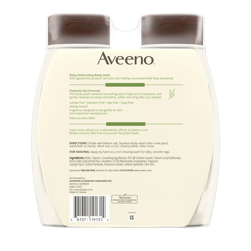 About this item Product details Aveeno Daily Moisturizing Body Wash with soothing prebiotic oat and a light scent nourishes dry skin. This creamy body wash gently cleanses and helps preserve skin's natural moisture barrier. 92% of users agreed that the nourishing cleanser left their skin feeling nourished while they showered. The allergy tested formula of the sulfate-free body wash contains nourishing oat to help lock in moisture, and gently cleanses dry, sensitive skin to reveal smoother, softer skin long after you shower. From the Dermatologist-recommended brand for over 70 years, this moisturizing body cleanser for sensitive skin from Aveeno is lightly scented, and formulated to be free of sulfates, parabens, dyes and soaps. To use, squeeze body wash onto a wet washcloth or hands, work into a rich, creamy lather, and rinse. Creamy body wash can also be used as a rich shave gel for silky, smooth legs. Follow with Aveeno Daily Moisturizing Body Lotion to lock in moisture for 24 hours.*Two moisturizing oat formulas Aveeno Daily Moisturizing Body Wash for dry skin with soothing prebiotic oat to nourish skin Daily shower body wash formula gently cleanses & helps preserve skin's natural moisture barrier Lightly scented cleanser contains nourishing oat to help lock in moisture & gently cleanses dry skin Sulfate-free body wash with prebiotic oat reveals smoother, softer skin long after you shower 92% of users agree that moisturizing bath wash left their skin feeling nourished while they showered Cleanser is suitable for sensitive skin, lightly scented & free of sulfates, parabens, dyes & soaps After cleansing, follow with Aveeno Daily Moisturizing Body Lotion to lock in moisture for 24 hours The Aveeno brand's goal is to have 100% recyclable, reusable or compostable packaging by 2025