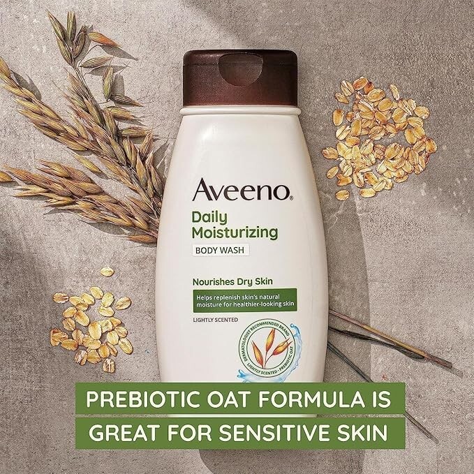 33-fluid ounce bottle of Aveeno Daily Moisturizing Sulfate-Free Body Wash with prebiotic oat and a light scent to nourish and gently cleanse dry skin to help preserve skin's natural moisture barrier Aveeno's unique formula combines prebiotic oat to help lock in moisture and gently cleanses to reveal smoother, softer skin long after you shower. 92% of users agreed this daily cleanser left their skin feeling nourished while they showered The daily cleanser is formulated for sensitive skin and features a light fragrance designed to be gentle on skin. The nourishing shower wash is allergy tested and free of sulfates, parabens, dye and soap Use this moisturizing body wash for dry skin with Aveeno Daily Moisturizing Body Lotion to lock in moisture for 24 hours. The creamy wash can also be used as a rich shave gel for silky, smooth legs Aveeno, a dermatologist recommended brand for over 70 years, has set a goal to have 100% recyclable, reusable or compostable packaging by 2025. We've relied on nature for generations. Now we're protecting its future