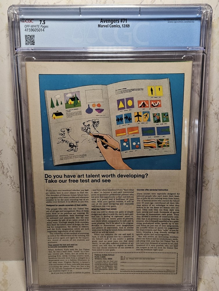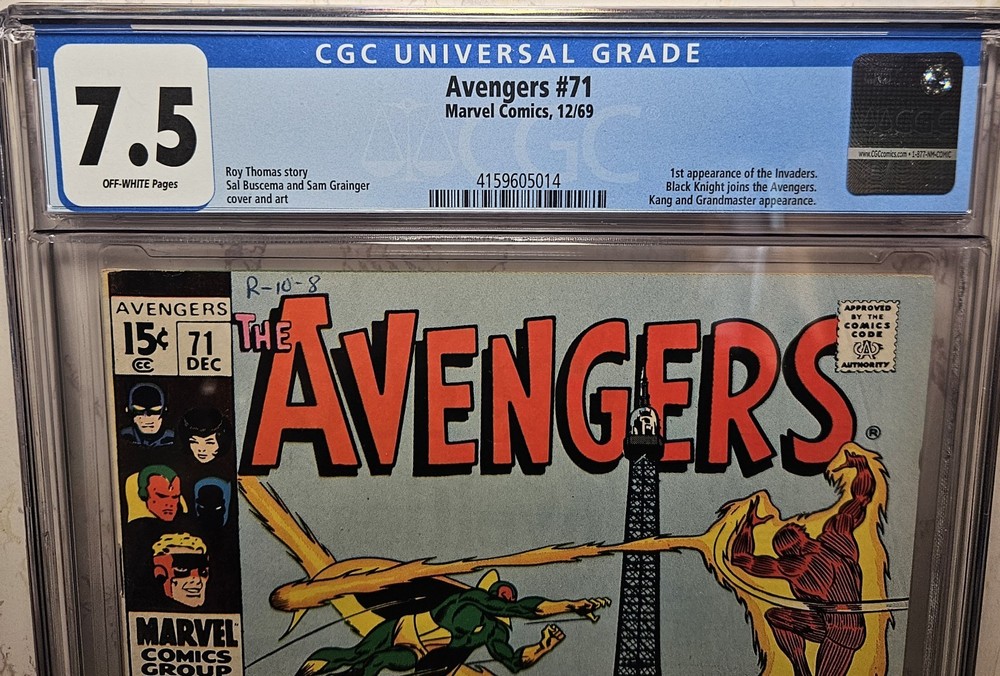 There is a minor scratch on the front top, right, barely noticeable, but I have to disclose... This is a rare and valuable Avengers #71 CGC 7.5 comic book from the Silver Age of comics. It features the first appearance of the Invaders, including Black Knight, and is a key issue for any Marvel (MCU) or Disney universe collector. The comic book is in English and intended for a general audience. The story title is Spider-Man and the issue number is 71. The comic book is a single issue, professionally graded by the Certified Guaranty Company (CGC), and comes with a certification. The superhero team featured is the Avengers, and the characters include Thor, Iron Man, Captain America, Vision, Scarlet Witch, and Black Knight. The comic book has a vintage look and feel, with a style of color, and is a great addition to any collector's list. #LRW