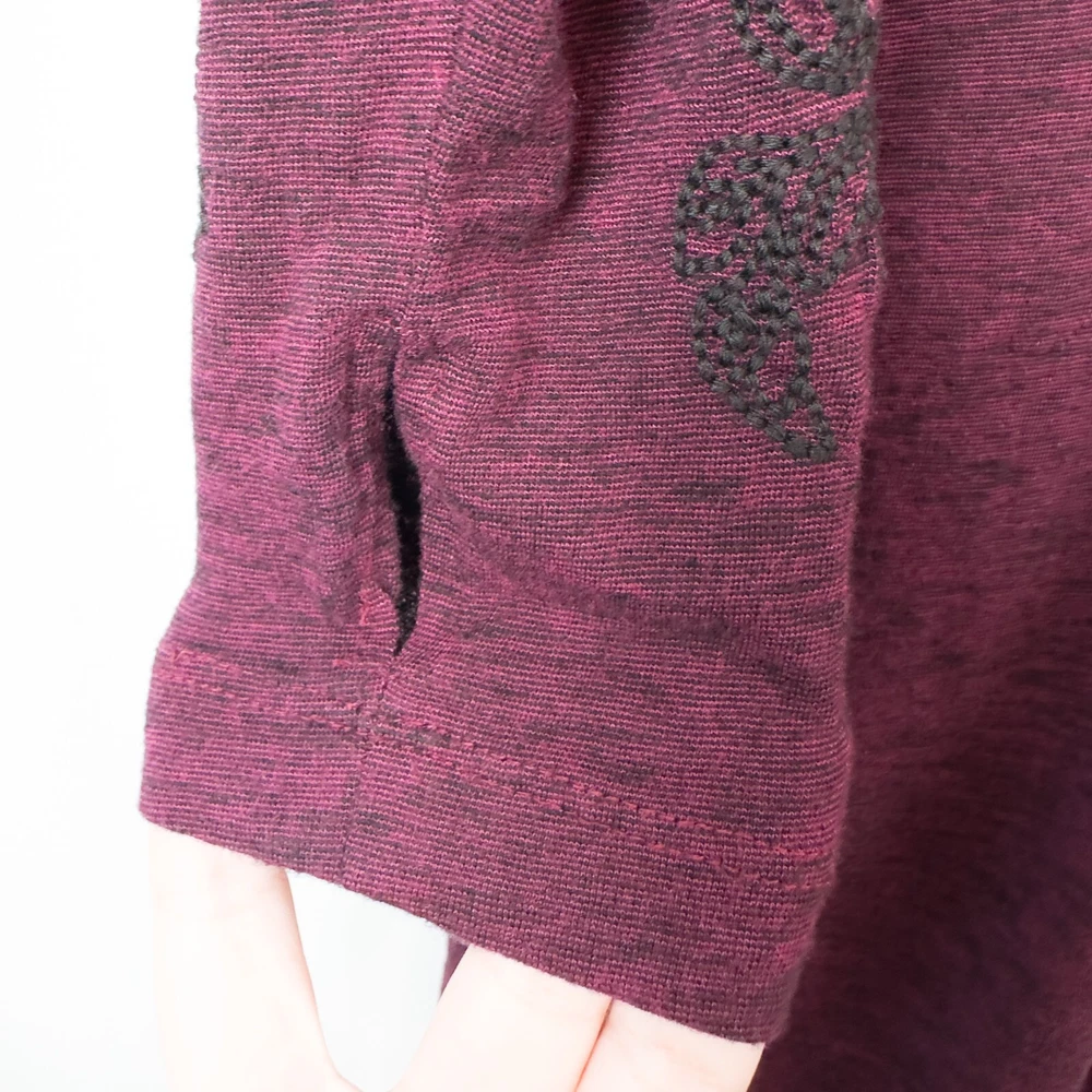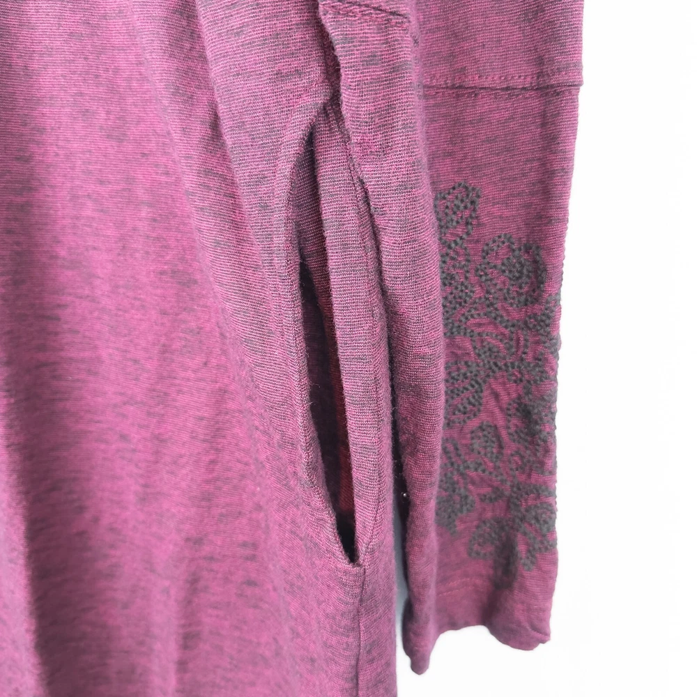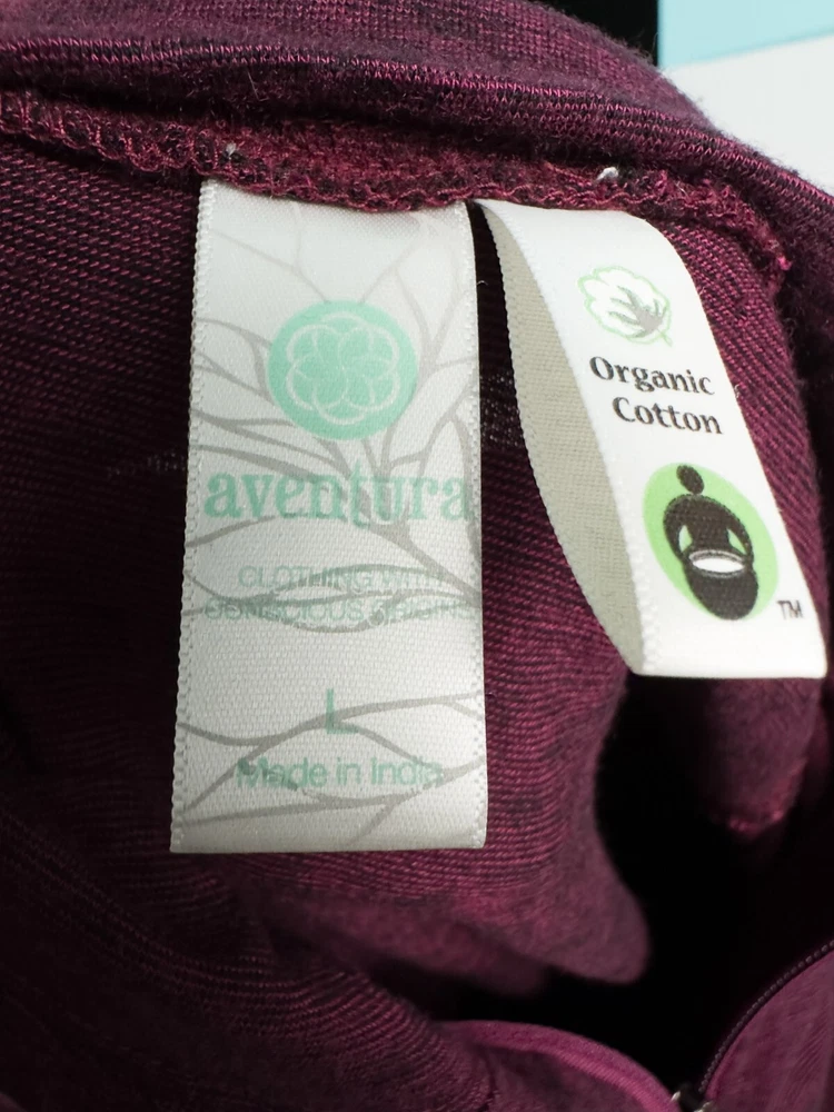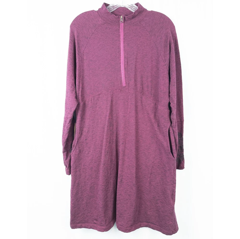 Aventura Clothing Addison Dress * Condition: Good pre-owned condition. There are a few small white spots on the front bottom left and back right shoulder; and a small hole in the upper back. Please see photos. * Size: Large * All measurements are approximate and taken lying flat. Please see photos as well. * Chest: 20” pit to pit * Length: 35” from shoulder to hem * Color: Magenta Purple * Material: 48% Organic Cotton, 47% Tencel Lyocell, 5% Spandex * Stretchy slub jersey knit fabric * 1/4 zip mock neck collar * Side seam integrated pockets * Raglan sleeves with embroidery detail * Thumb holes * Style: P83309 * Machine Washable All of my items are stored in a smoke-free, dog-friendly home.