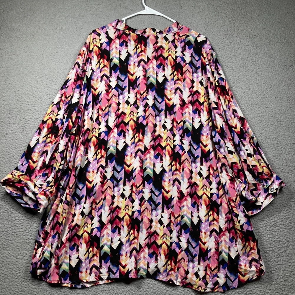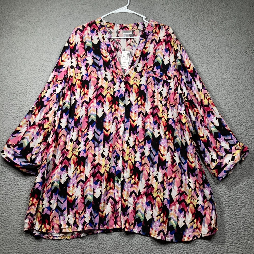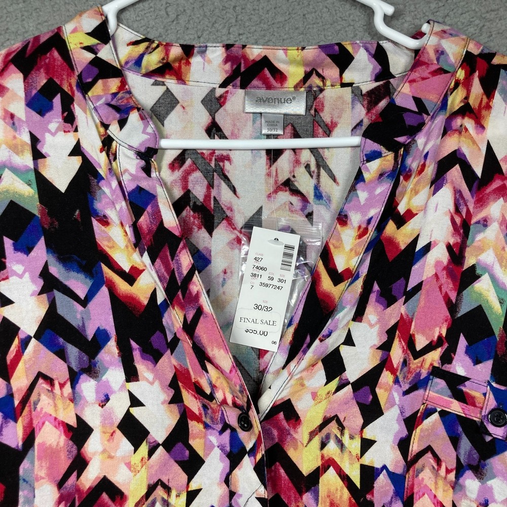 For sale: Avenue Top Women's Plus 30/32 Purple Print Long Sleeve Roll Tab Flowy Button Up Please check photos carefully for details/measurements. Measure your favorite garment and compare. This item may be wrinkled upon arrival due to packaging. We welcome questions and offers! Thank you for taking time to view and consider this item!