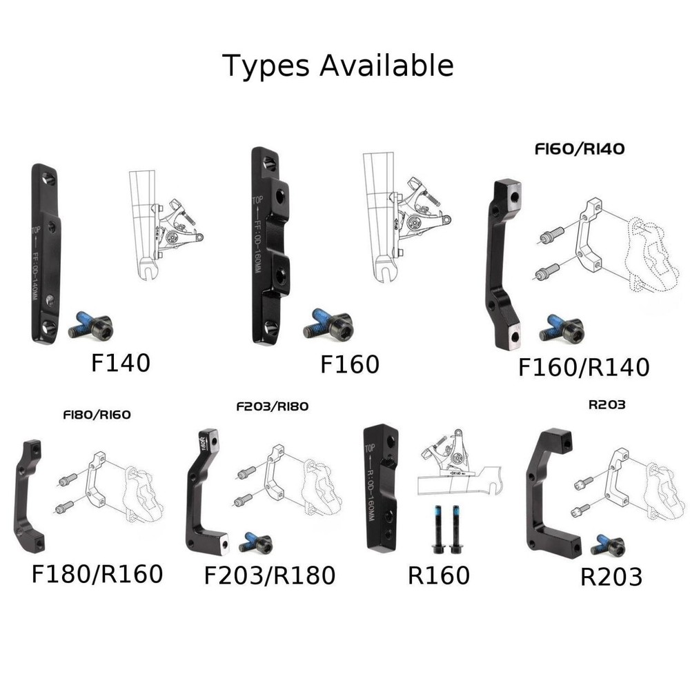 Product Description Features: * brand new and high quality. *For Shimao Disc Brake Caliper Mount Adapter - Front / Rear - Post / IS. *Interchangeable, for precision engineered disc calliper mount adapter. *Range of sizes and mounting options to suit most brake setups. Specifications: Material: Aviation Aluminum Alloy Color: black, Size: 140,160, 180, 203mm F180/R160 (The adapter is used on the B-pillar front fork with 180mm discs, and used on the B-pillar frame rear fork with 160mm discs) F160/R140 (The adapter is used on the B-pillar front fork with 160mm discs, and used on the B-pillar frame rear fork with 140mm discs) F203/R180 (adapter is used for B-pillar front fork with 203mm disc, and for B-pillar frame rear fork with 180mm disc) R203 (adapter for B-pillar front fork with 203mm disc) R160 (adapter for B-pillar front fork with 160mm disc) F160 (used on the rear fork of the frame with 160mm discs) F140 (adapter for B-pillar front fork with 140mm disc) package: 1 x Adapter 2 x Bolts Note: 1. The real color of the item may be slightly different from the pictures shown on website caused by many factors such as brightness of your monitor and light brightness. 2. Please allow slight manual measurement deviation for the data. Payment Payment must be completed within 5 days. If you have any problems about payment, please contact us via ebay message. Delivery details We only ship to confirmed ebay Order addresses. Please comfirm that your Order address is in line with your shipping address. Please kindly note that the c ombined shipping is not provided because the shipping fee is calculated by weight. Also, the each additional item means exactly the the same color and size. It takes about 7 -15 working days to US; about 10-30 working days to other countries. Transit time may be a little delayed because of the bad weather and customs inspection . If you do not receive your item within 30 working days since payment finished, please contact us immediately for further assistance. Contact us We strive for 100% customer satisfaction! Positive Feedback is very important to us. If you have any questions, p lease feel free to contact us via "Ask seller a question" . We will reply your email within 24 working hours.
