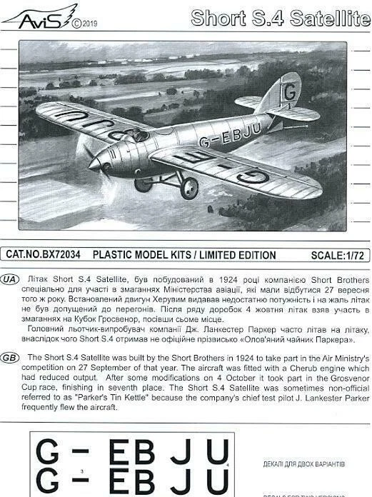 Avis 72034 Plastic Model Kit Scale 1:72 Short S.4 Satellite "Parkers Tin Kettle" Plastic model kit High-quality details. Scale: 1:72 High-quality details. Manufacturer: AVIS (Ukraine) Country/Region of Manufacture: Ukraine Composition: Plastic Model Kit Material: Plastic Paint: Unpainted, Unassembled, Kit do not contain paints and glue. Condition: New in Box Features: Kit Airplane scale model 1/72 Scale model kit Short S.4 Satellite """"Parkers Tin Kettle"""" (Avis No.72034) Length, mm: 101 This set includes: 2 sprues with parts decal (sticker) scheme for painting model detailed instruction Glue and paints are not included Quality set, simple assembly. Suitable for experienced modelers, as well as for beginners. Due to the use of modern production technologies, all the details of the model fit perfectly, thanks to this, you can get an excellent result with minimal effort. ----------- This is a plastic model kit. Assembly and painting is required. Paint and glue is NOT included. Item Type: Scale model kit Commodity Attribute: Assembly The model is a plastic assembly model and needs to be assembled and painted by yourself You need an extra purchase of the glue, paint and so on!