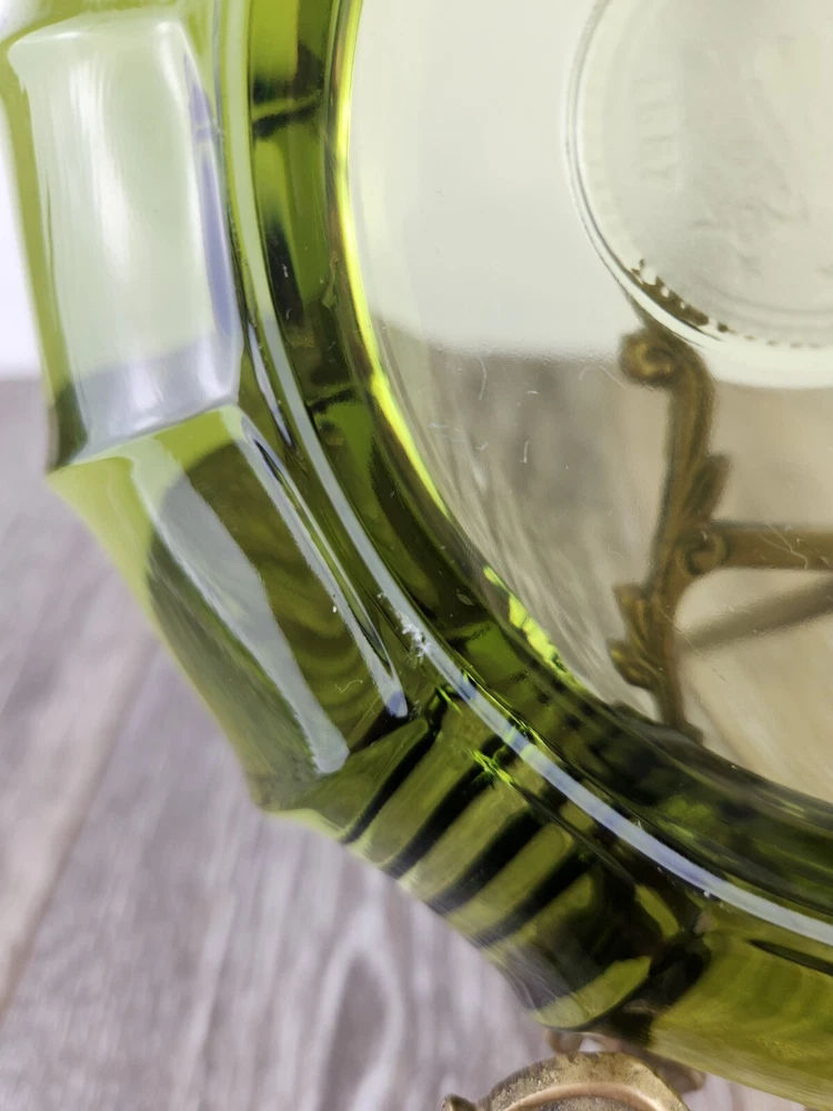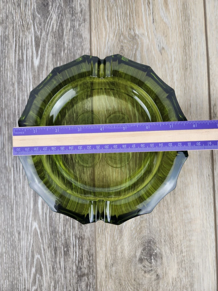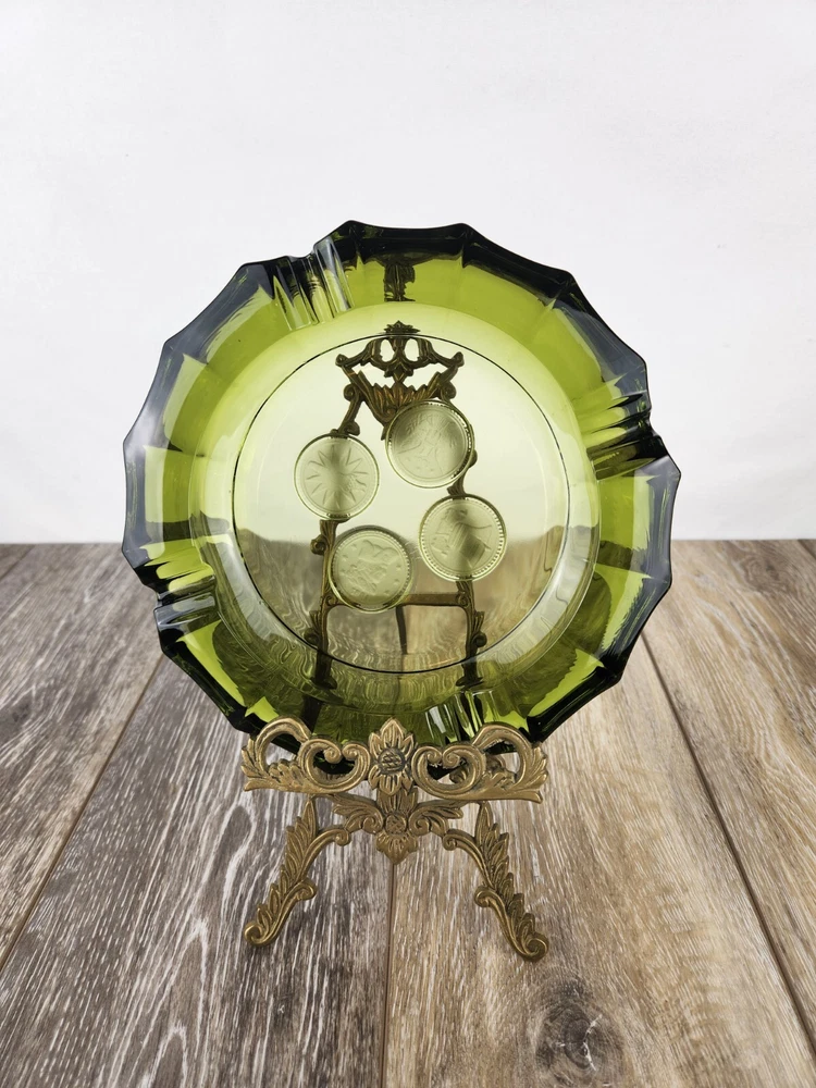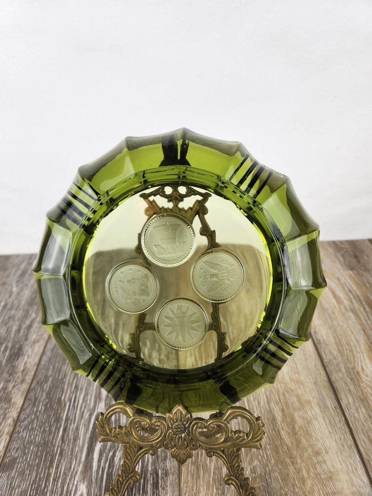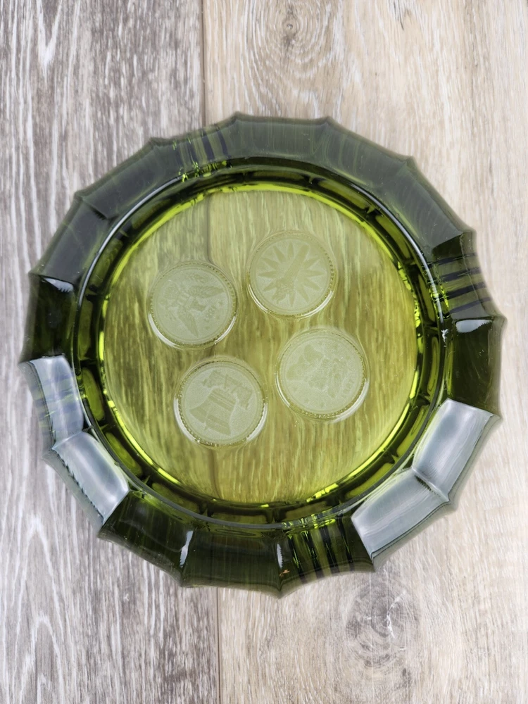 This heavy glass ashtray from Fostoria is a vintage treasure featuring the 1887 Liberty Bell and Eagle design. Made in avocado green, this piece combines both beauty and history, offering collectors a piece of American craftsmanship to admire. The heavy glass ensures that it remains sturdy and durable, while the intricate design adds a sense of sophistication. Whether used as a functional ashtray or a decorative item, this Fostoria Coin 1887 ashtray is a perfect addition to any collection. *There are a few very tiny flea bites on the under side. Photos are shown.