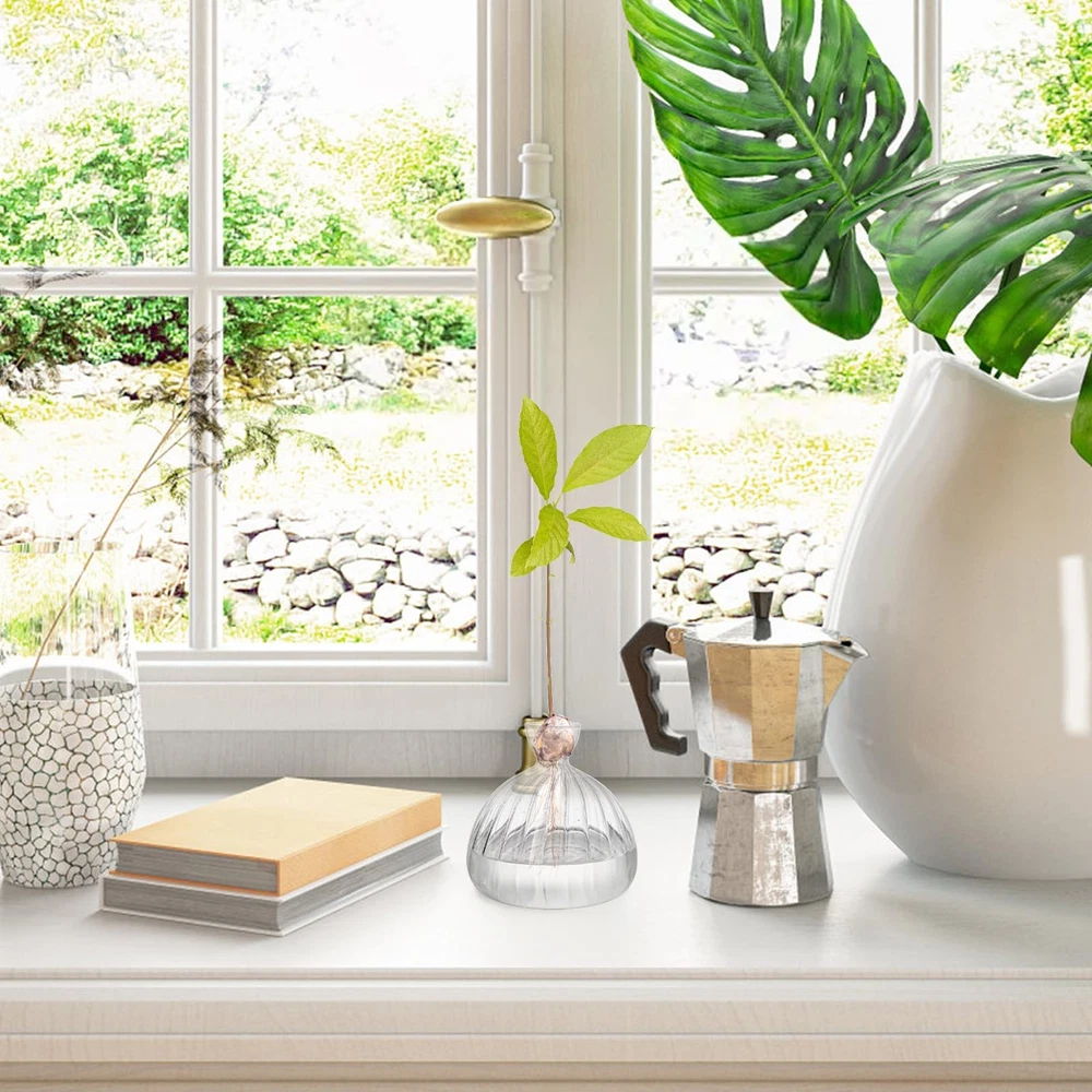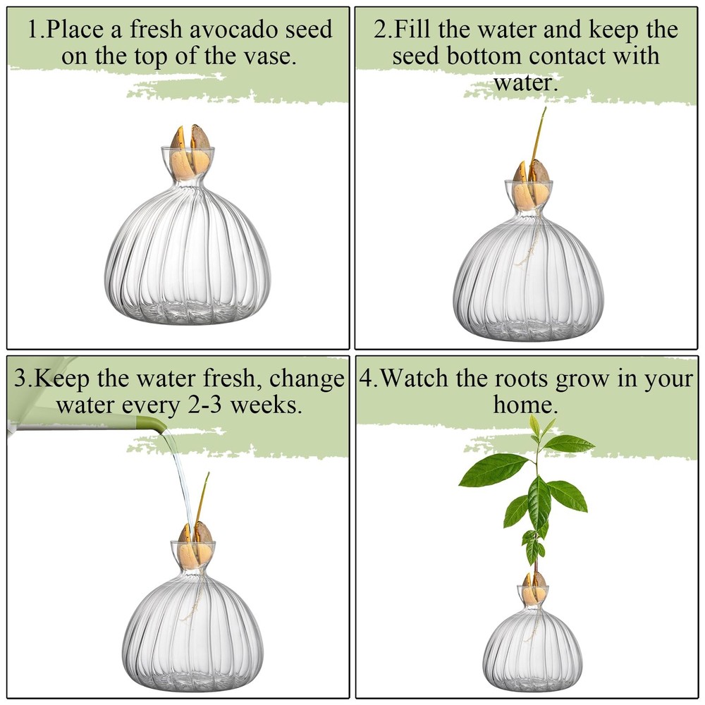 Avocado Seed Sprout Starter Vase Planter Pot, Avocado Tree Growing Vase Glass Container, Clear Striped Glass Propagation Jars for Hydroponics Plants Home Garden Office Decoration avocado tree vase with simple style is well designed with narrow opening and wide bottom, making it suitable for holding avocado seeds and stable enough to sit on the desktop. Our seed starter vase is made of glass, they are crystal clear in appearance, helping them give off beautiful sparkles and shines under the sun. Avocado seed growing vase serves as a perfect gift for people who are interested in growing plants. With this glass vase, they can enjoy the growing process and the beauty of nature. Product Dimension: You will receive one clear avocado glass vase which measures 2.0" in upper diameter, 5.9" in bottom diameter and 5.9" in height. It is suitable for planting avocado seeds and other hydroponics plants. Cute Design: Our striped glass vase are deigned with a wide and spherical body as well as a narrow neck, which can hold avocado seeds perfectly, leave plenty of space for them to sprout, and stable enough to avoid toppling over. Practical Material: Being made from glass, seed starter vase planter pot is clear in appearance, making it sparkling and shining especially during the day when the sun hits the glass just right. This material is also easy for observation. Easy to Use: Our seed sprout glass container is easy for you to plant avocado seeds. Just sit one seed into the vase mouth, fill water in it until the seed rest above the liquid, and wait for the growing process. Meaningful Gift: avocado tree growing vase is a great gift for people who loves plants. With the sinuous shape of the vase, the growing process will be magnified, and you will surely experience the joy of nature.