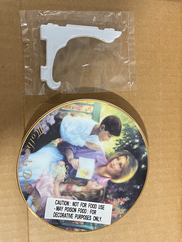 Celebrate the special bond between a mother and child with this beautifully crafted collector plate from Avon. Made of high-quality porcelain with a 22k gold trim, this round plate has a diameter of 5 inches and features a heartwarming image of a mother and child. The plate is decorated with intricate art, showcasing the theme of Mother's Day and making it a perfect gift for this occasion.The plate comes with a box and holder, making it easy to display and store. It was manufactured in Thailand in the late 20th century and is part of Avon's Mother's Day product line. This decorative collector plate is ideal for those who appreciate art and is a great addition to any collection. Some my items may smell like tobacco smoke mainly the Dvd's the cardboard cases hold the odor or may have animal hair on them please be advised if you may be allergic to smoke or animals please do not bid on items Also reminder if you buy something that says New Vintage or says New and 20 Years old and comes with batteries that they will most likely be corroded if package was never opened This applies when buying my items thanks and I DONT ACCEPT RETURNS THANKS FOR LOOKING!!