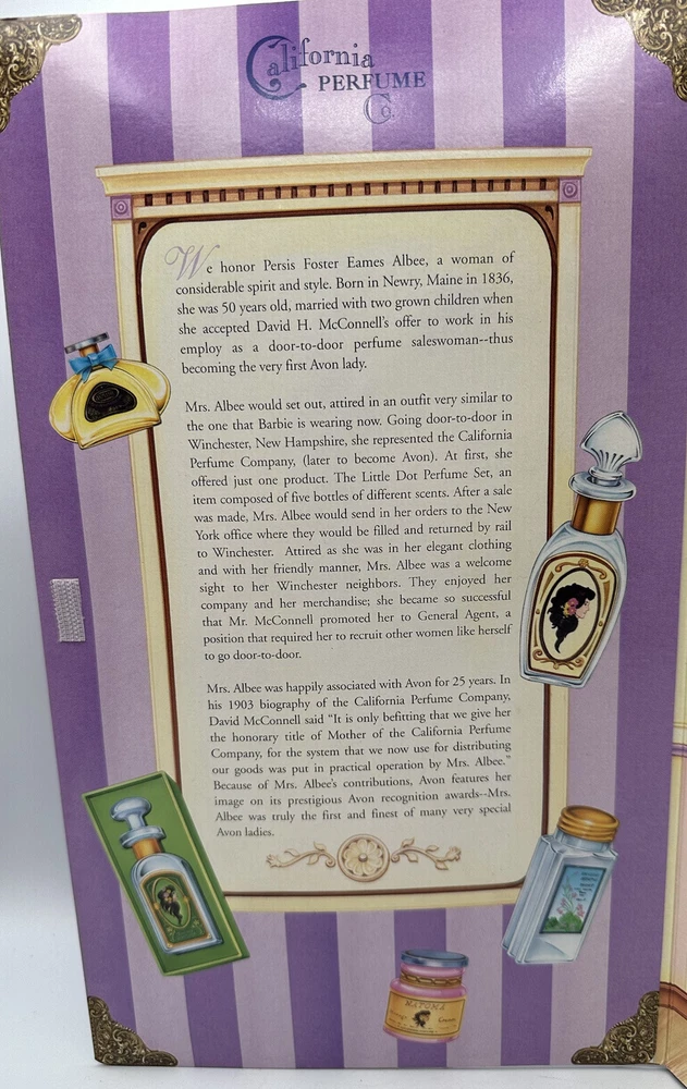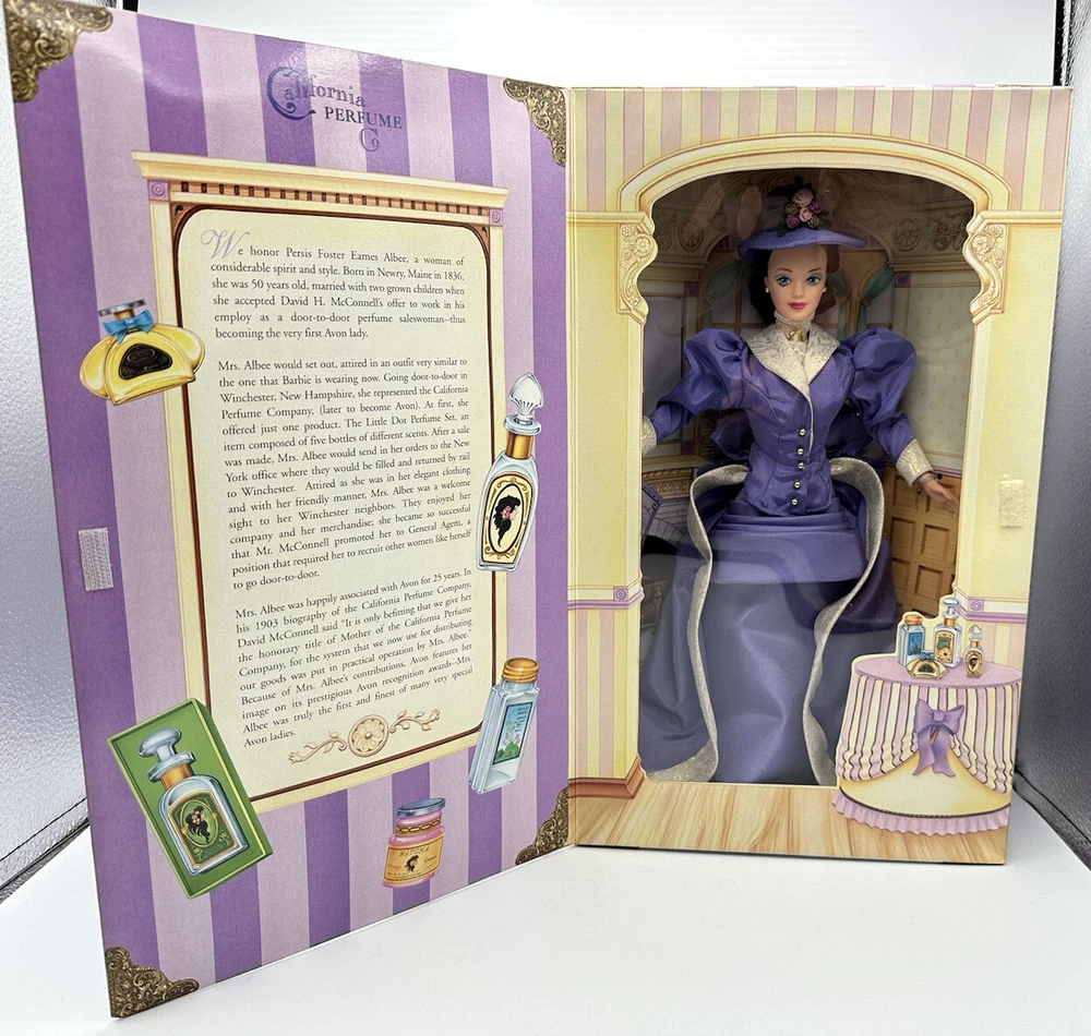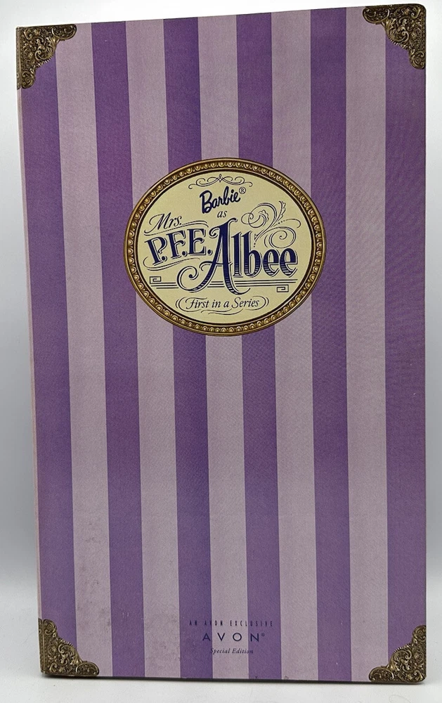 Introducing the Avon Barbie as P.F.E. Albee, the first in a special edition vintage series from 1997. This 11.5" girl doll features black hair and blue eyes, and comes dressed in a skirt, jacket, jabot, hat, shoes, and panties, along with a jewelry brochure, doll stand, and all in the original (opened) packaging. The doll is made of plastic and is recommended for ages over 14. This special edition fashion doll is a must-have for collectors and fans of the Avon franchise. It's perfect for all occasions and is sure to make a great addition to any doll collection. So don't miss out on the chance to own this unique and rare piece from 1997!