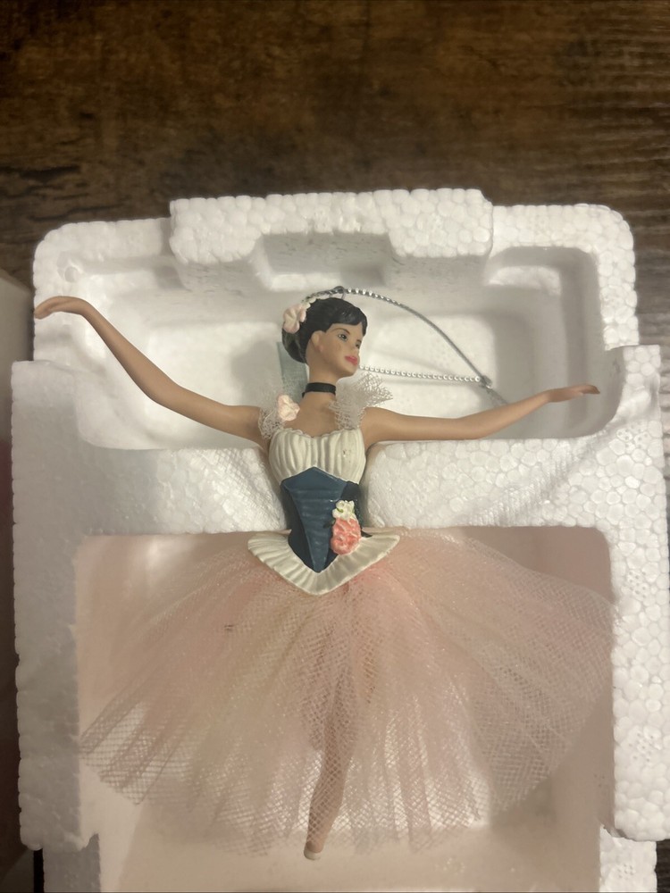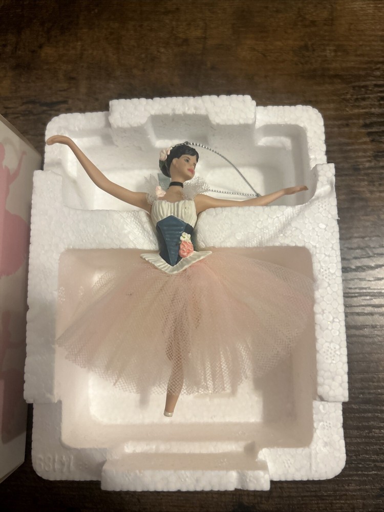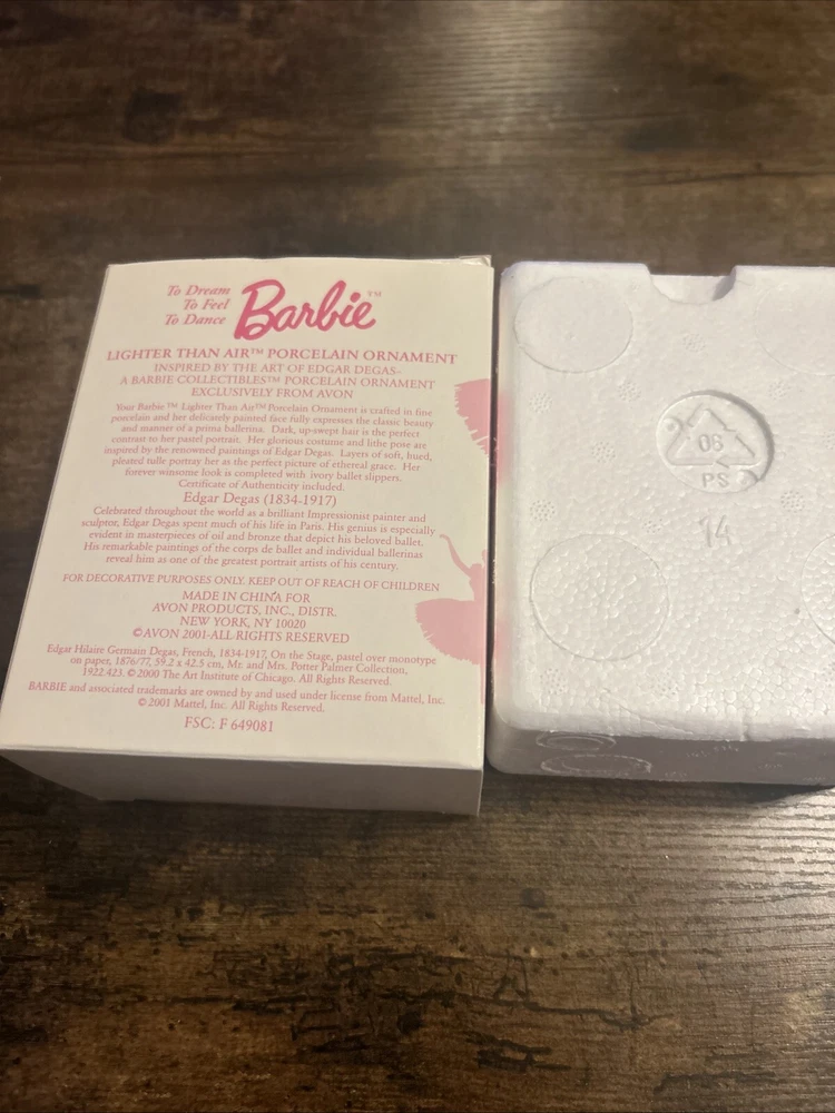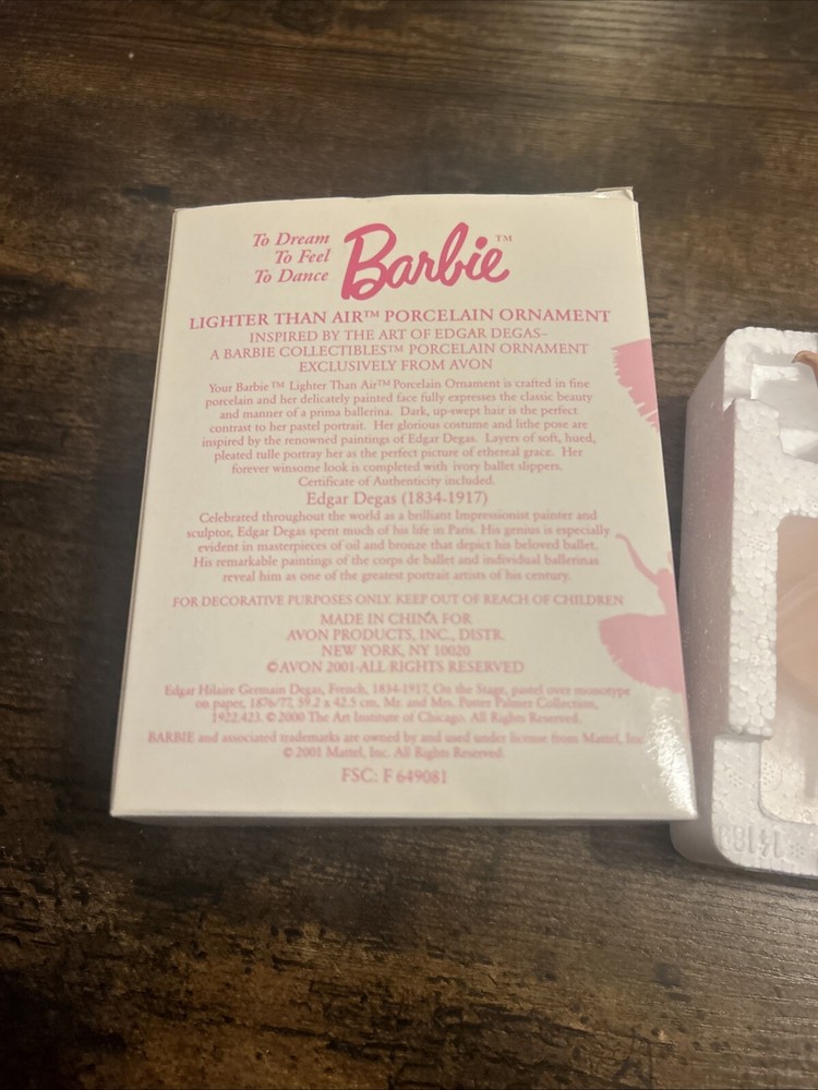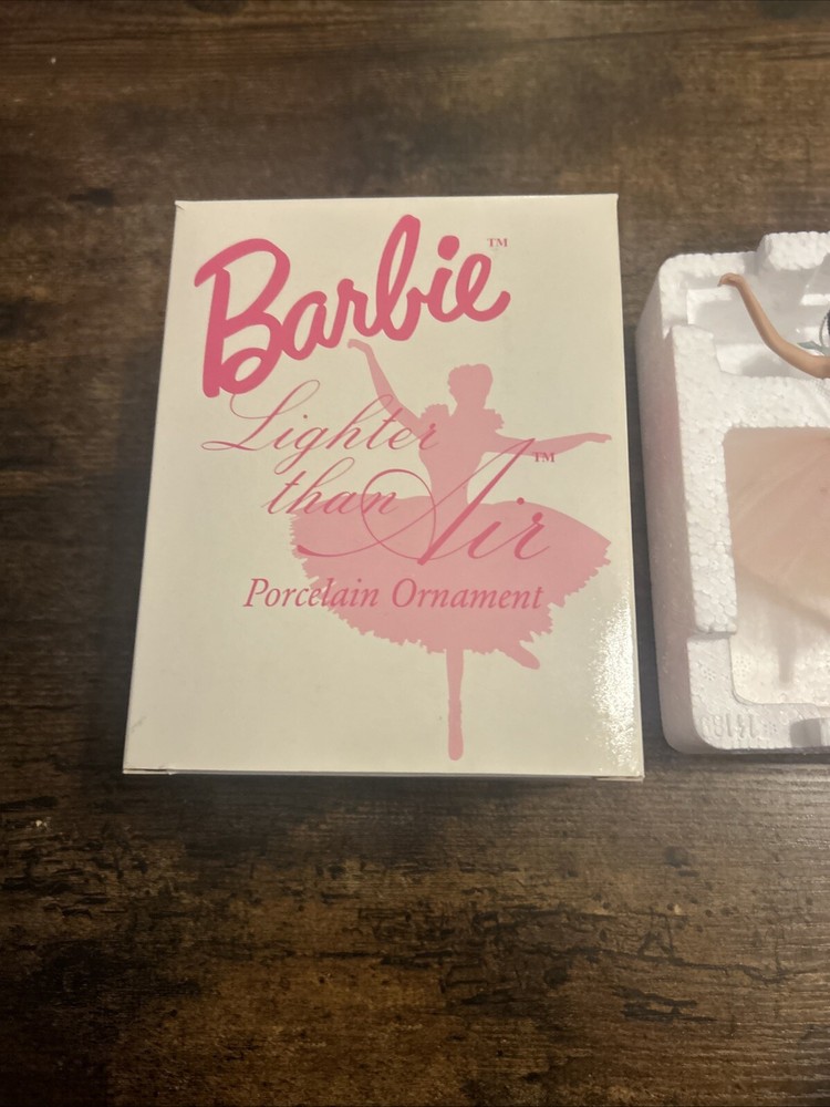 The product is a Barbie Lighter Than Air Porcelain Ornament manufactured by Mattel in 2001. This ballerina-themed ornament features a Caucasian Barbie doll dressed in a pink ballerina outfit. Made of porcelain, this ornament was created for Avon and is part of a series from the year 2001. It is designed to be hung as a decorative piece, likely for holiday or seasonal decor.