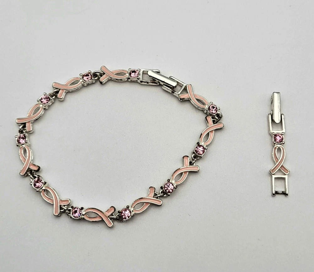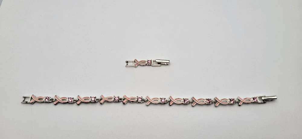 Show your support for breast cancer awareness with this stunning silver tone bracelet from Avon. Adorned with pink rhinestones and enamel pink ribbons, this bracelet is in great condition. Bracelet is 7” long & has 1.5“ extra link extender (if you need longer length)