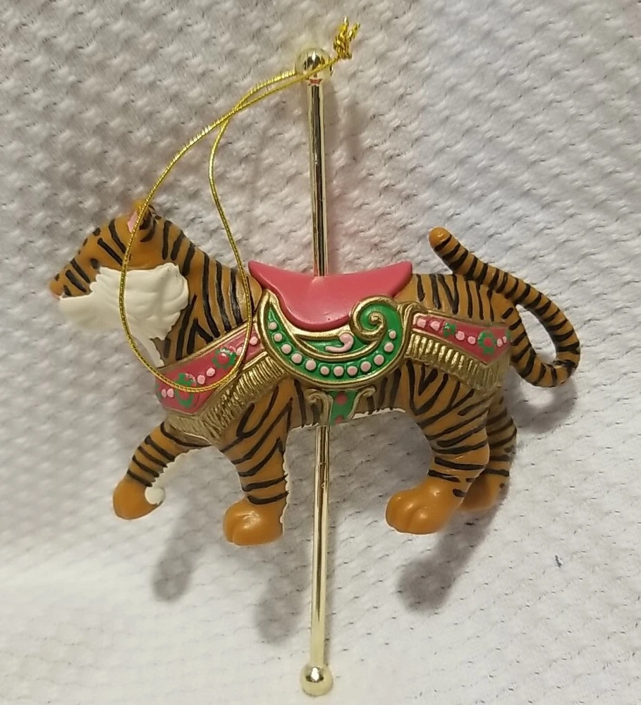 This Avon Gift Collection Christmas Ornament Carousel features a beautiful exotictiger design that is perfect for adding a touch of wildness to your holiday decor. Made of durable plastic and measuring small in size, this hanging ornament is sure to catch your eye and add a unique touch to your Christmas tree. The multicolor geometric pattern and animal theme make it a great addition to any Christmas decor collection. Whether you're an animal lover or simply looking for a unique decoration, this Avon tiger ornament is sure to impress. Nice vintage condition