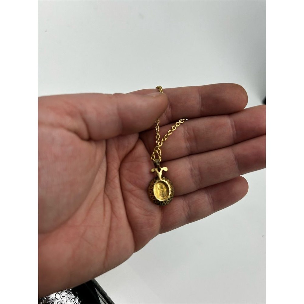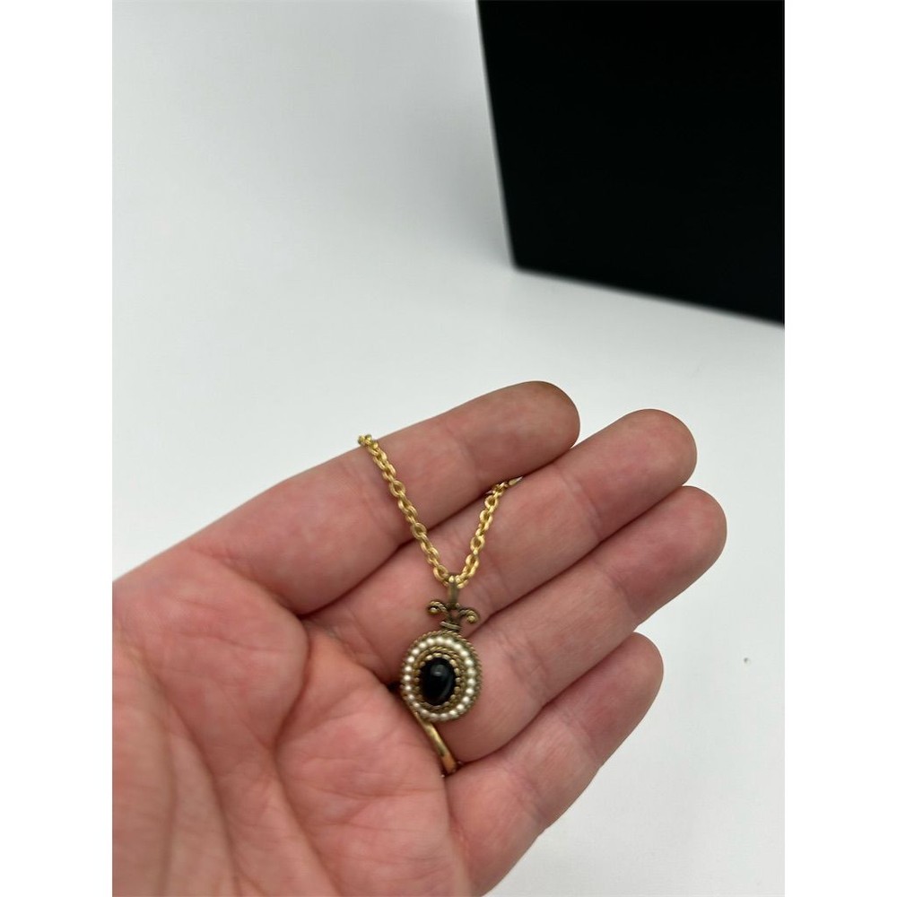 This vintage-inspired pendant necklace by Avon exudes timeless elegance with its striking black stone centerpiece suspended from a lustrous gold chain. Adorned with delicate pearls, it effortlessly combines sophistication and charm. Whether for a formal event or a casual outing, this piece infuses a classic allure into any outfit. A pre-owned treasure with a unique story, it is now ready to become a part of yours.