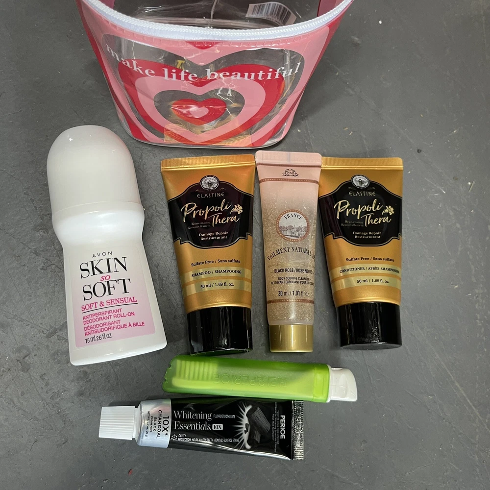 Brand: Avon Scent: black Rose Item Weight: 16 oz Set Includes: Body Scrub, Deodorant, Lotion, Shampoo, Conditionet, toothpaste, toothbrush, Case MPN: 002-921 Ingredients: Read the label Pattern: Heart UPC: 803954303247 Color: Multicolor gtin13: 803954303247 Size: Travel Size Expiration Date: N/a Department: Unisex Features: Alcohol-Free, Animal Cruelty-Free Shape: N/A Product Line: Veilment Country/Region of Manufacture: Unknown Formulation: Foam, Lotion, Spray, mixed Type: Travel Set