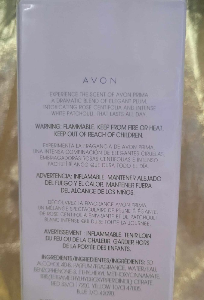 Avon PRIMA EDP Perfume Spray ~ 1.7oz ~ The photos shown is the actual item you will receive in your order. This beautiful fragrance is currently not available to purchase from the company. This is newer stock recently purchased. About this fragrance: Prima Eau de Parfum is an elegant embodiment of strength and grace. Warm and dreamy notes twirl together effortlessly to create a delicate, feminine and quietly powerful NOTES: • Top: Delicate plum • Middle: Pink rose • Dry: White patchouli Fragrance Category: Warm & Dreamy – Warm floral scents with flowing, silky and romantic notes. ABOUT US: All of our listed items come from a smoke-free/pet-free home. Our items have NEVER been exposed to extreme temperatures or direct sunlight that may alter their quality. All our items are well packed in boxes & stored. Next business day shipping. You will receive your item in great condition as we pack very carefully for shipment. We are in no way affiliated with AVON Company LLC or AVON Representatives OR any other fragrance or beauty companies. >> LOTS more hard-to-find items available. Click the OTHER ITEMS BLUE BUTTON below to see all our listings We have hundreds of items listed & in stock. We have access to many discontinued & hard-to-find items. If there is a particular discontinued or current item you need, just message us through eBay & we will try to help. We are happy to combine ship for you.