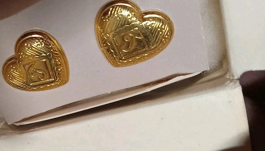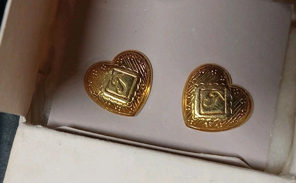 These Avon earrings feature a heart-shaped design with the letter "J" inside, made of gold-toned metal with surgical steel closure. They are suitable for various occasions like Mother's Day, Christmas, and birthdays. The earrings have a stud style and are designed for the earlobe. The personalized touch adds a sentimental value, making them a perfect gift choice. LOOK AT PHOTOS, BOX IS REALLY SQUISHED!