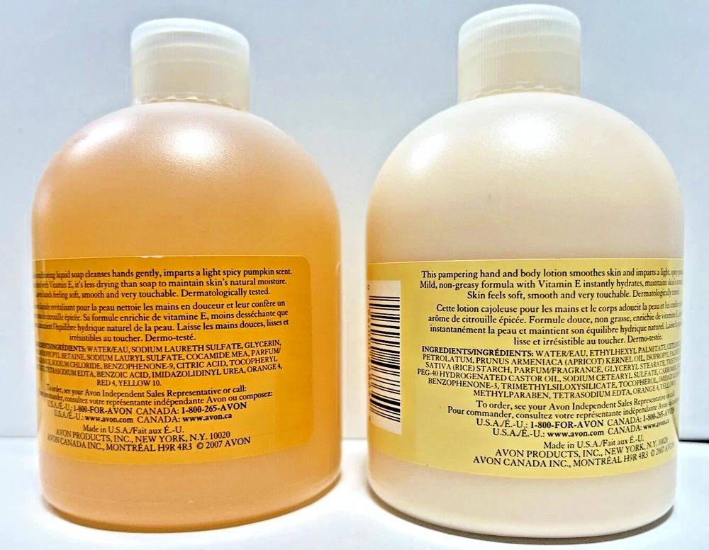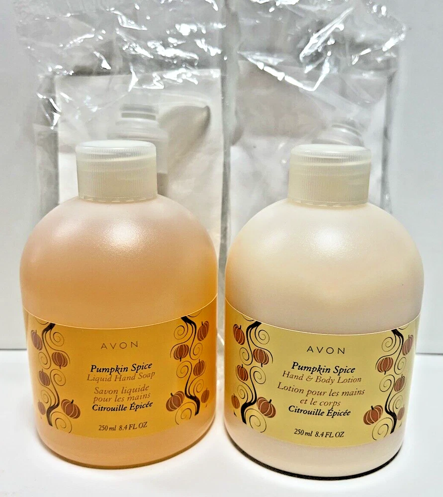~ Avon Pumpkin Spice ~ Buyer will receive 1 of each: 1- Liquid Hand Soap with Pump and 1- Hand & Body Lotion with Pump ~ each are 8.4 fl. oz. ~ ~ Discontinued Items ~ ~ New Factory Sealed ~ ~ Comes From Pet & Smoke Free Environment ~ Thanks for Looking Returns are accepted within 30 days of confirmed delivery. Returns must be in resalable New and Factory Sealed condition (same as purchased) and include a copy of the sales invoice you received with the item Shipping could be USPS, FedEx Ground Economy, or UPS, depending on the location of delivery