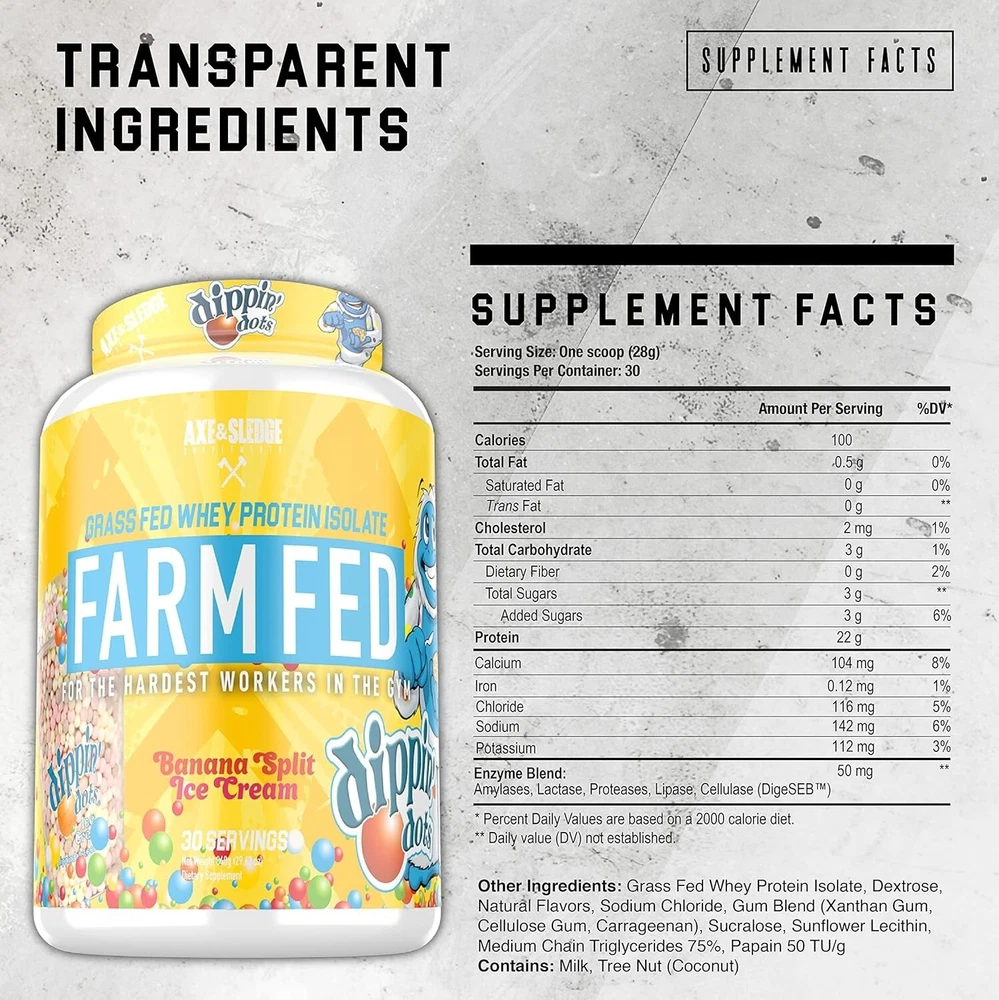 Improved Product Description for TikTok: Looking for a protein powder that works as hard as you do? Meet Axe & Sledge Farm Fed Grass-Fed Whey Protein Isolate — the ultimate blend of flavor and nutrition! 🌟💪 Key Features You’ll Love: ✨ Grass-Fed Goodness: Made from 100% grass-fed whey, giving you clean, high-quality protein. ✨ Banana Split Ice Cream Flavor: Indulge in the creamy, dreamy taste of banana split without the guilt. 🍌🍦 ✨ 30 Servings: A whole month's worth of protein-packed fuel! Why It’s Perfect for You: ✅ For Fitness Lovers: Whether you're building muscle, toning up, or recovering post-workout, it’s your go-to. ✅ For Busy Lifestyles: Need a quick meal or snack? Mix it in seconds for an instant protein boost! What’s Inside: 🌱 Ingredients: Grass-fed whey protein isolate, natural & artificial flavoring, stevia, and sunflower lecithin. 🍫 Nutritional Value (per serving): Protein: 22g Calories: 100 Carbs: 2g Fat: 0.5g Why Choose Grass-Fed? Grass-fed whey delivers a clean protein source with a better nutrient profile and no added hormones! Quick & Easy to Use: Mix 1 scoop with water, milk, or your favorite beverage. Blend into smoothies for an extra boost. Bake into recipes like protein pancakes! Fuel your day with the delicious taste and pure nutrition of Farm Fed Whey Protein Isolate. 🍦💪 Perfect for athletes, fitness enthusiasts, and anyone needing a clean protein boost!
