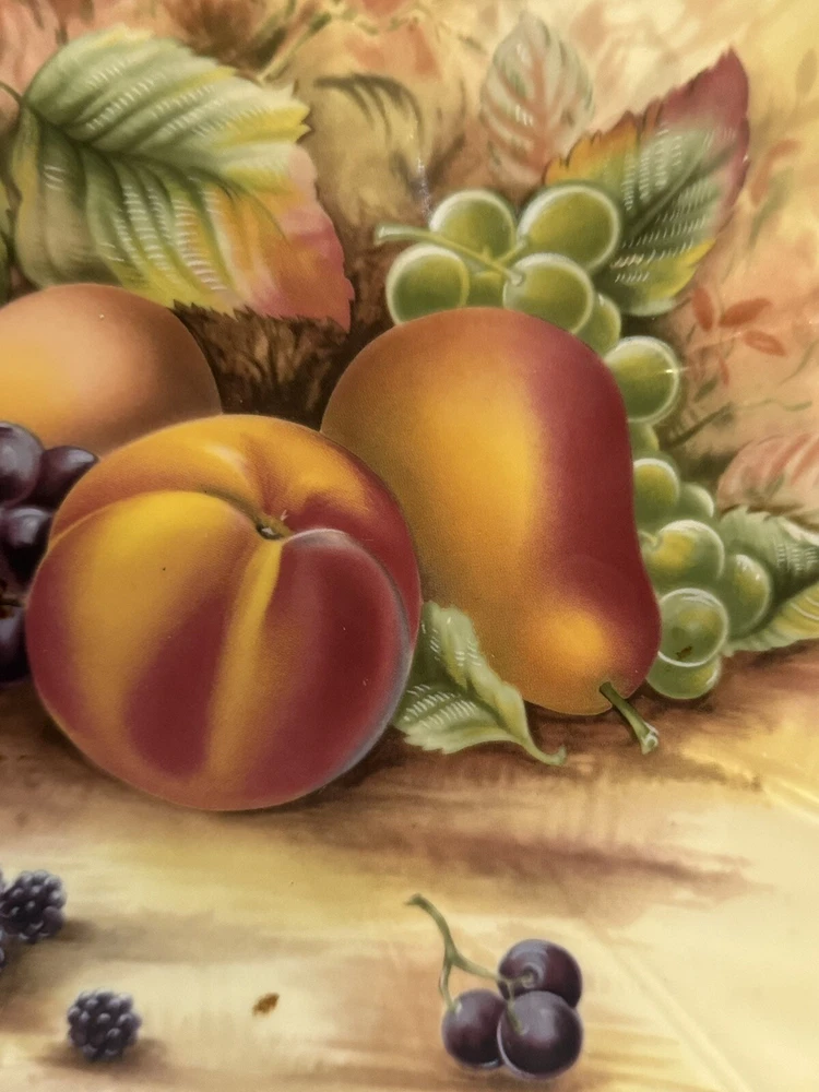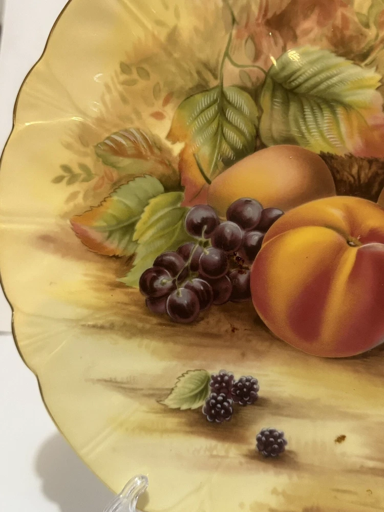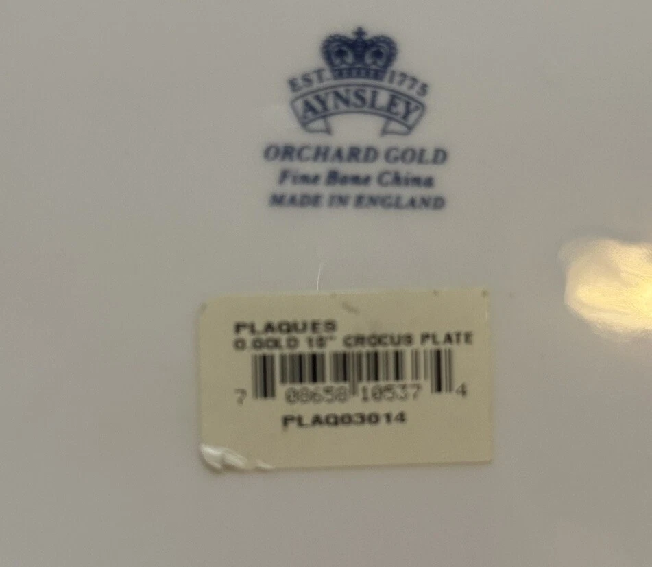 Pattern: Orchard Gold Production Style: Art Pottery Set Includes: Dinner Plate Handmade: No Antique: No Type: Dinner Plate Origin: England Shape: Round Theme: Fruit, Food Backstamp: Printed Original/Licensed Reproduction: Licensed Reproduction Color: Multicolor Country/Region of Manufacture: United Kingdom Vintage: Yes Plate Diameter: 10.5 in Brand: Aynsley Material: Bone China Production Technique: Pottery Occasion: All Occasions