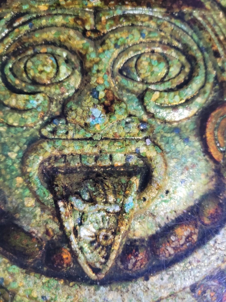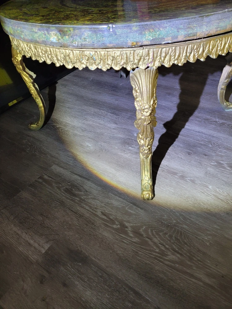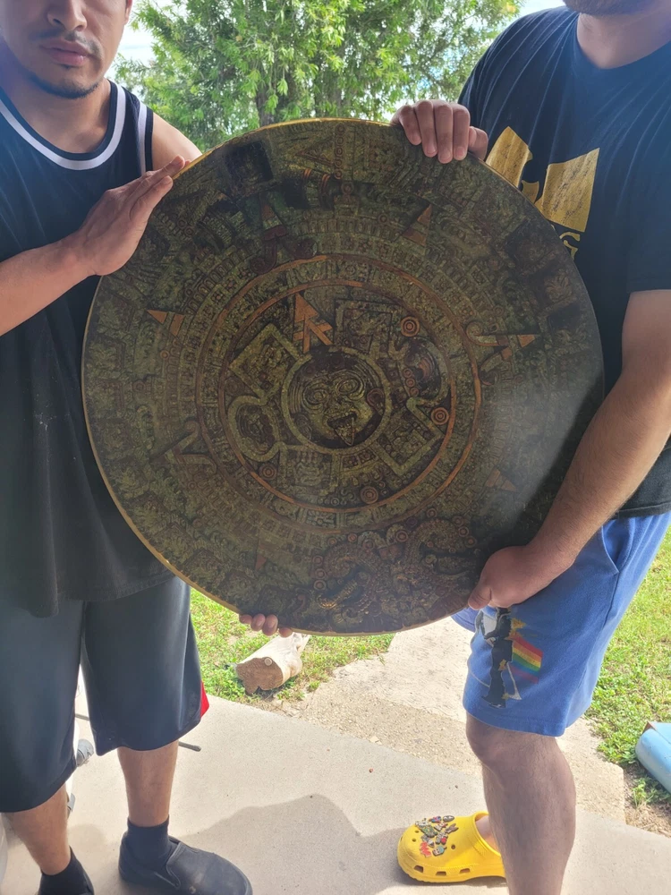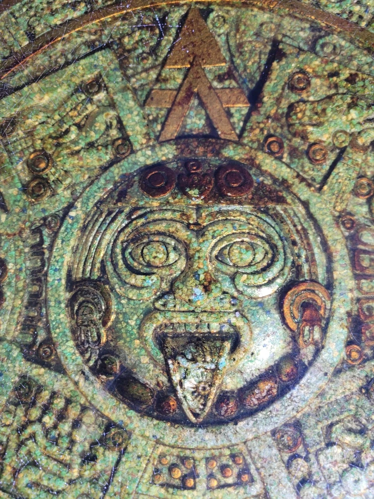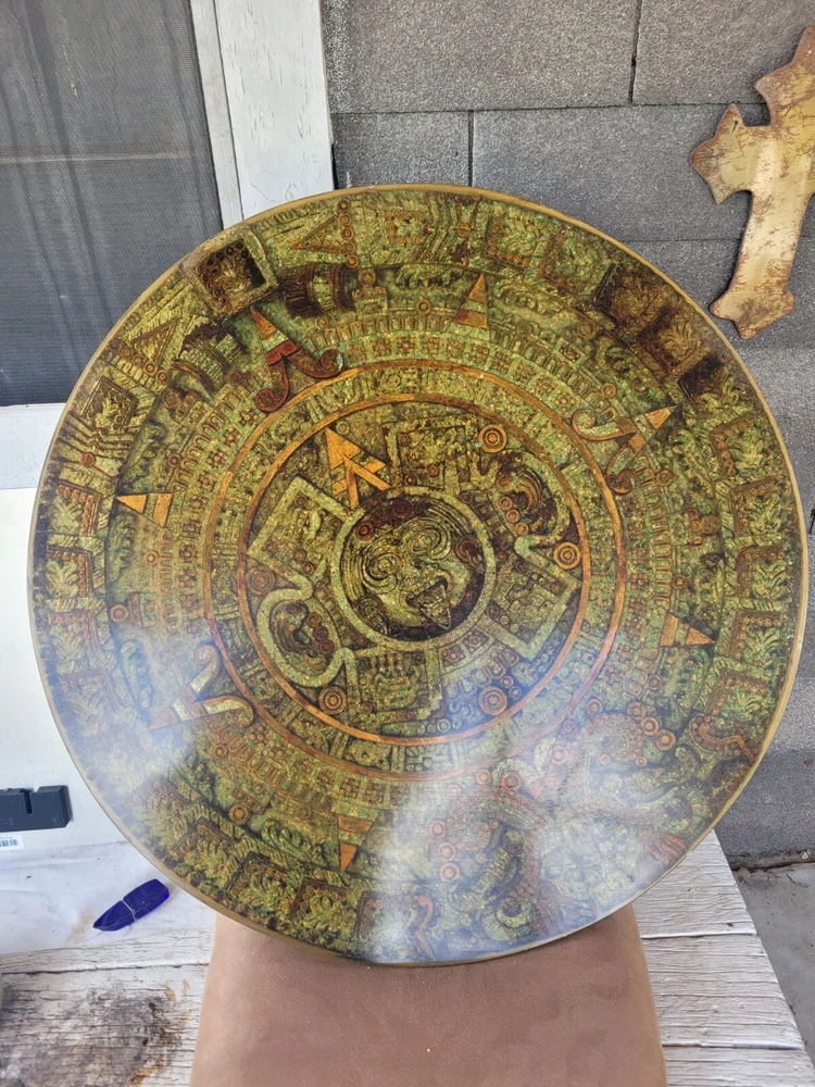 Beautiful coffee table of Aztec calendar, no makers mark but definitely Mexican product from the late 20th century. Looks like it is underwater.