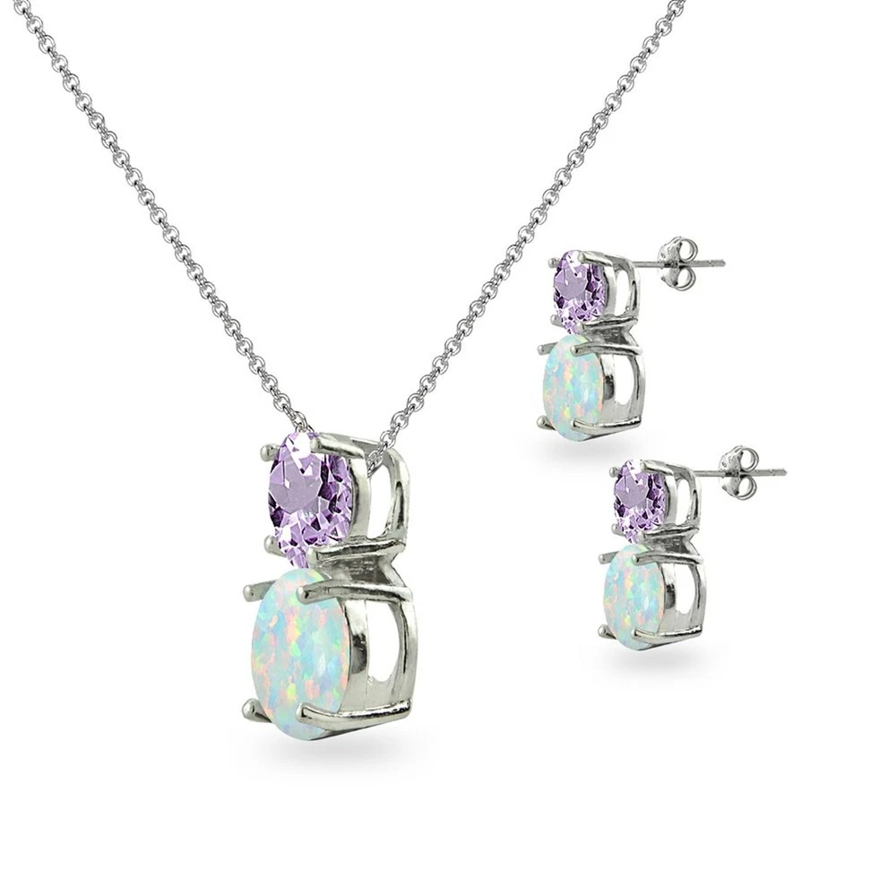 B. BRILLIANT Opal Necklace and Earrings Jewelry Set for Women or Bridesmaids, Genuine, Simulated or Created Gem & Opal Double Round Stones, .925 Sterling Silver Sets With Gift Box Product Details Color: Amethyst Brand: B. BRILLIANT MPN: US_JWEY_B079TW65GG UPC: Does not apply EAN: Does not apply Department : womens Date First Available : February 15, 2018 Manufacturer : GemStar USA Brand, Seller, or Collection Name: B. BRILLIANT Metal stamp: 925-sterling Metal: Sterling Silver Material: Sterling Silver Gem Type: Amethyst Minimum total gem weight: 2.59 carats Setting: prongs Height: 0.55 inches Width: 0.31 inches Length: 18 inches Chain: Rolo Clasp: Spring Ring Clasp Resizable: No Number of stones: 6 Stone Weight: 1.25 carats Model number: US_JWEY_B079TW65GG Sterling Silver Genuine, Simulated or Created Gemstone & Synthetic Opal Double Round Stud Earrings & Necklace SetThe necklace showcases a round 6mm gemstone nested above a 8mm synthetic opal gemstone, for a gorgeous two-stone friendship style set. The pendant measures 14mm in length and dangles from a 18-inch rolo chain that secures with a spring-ring clasp. The stud earrings feature a pair of round 5mm gemstones nested above 7mm synthetic opal gemstones. The earrings measure 12mm in length and secure by post with friction backs. Choose from the Following Colors:Amethyst, Garnet, Created Blue Sapphire, Created Pink Sapphire, Created Ruby, Simulated Emerald, Blue Topaz, White Topaz