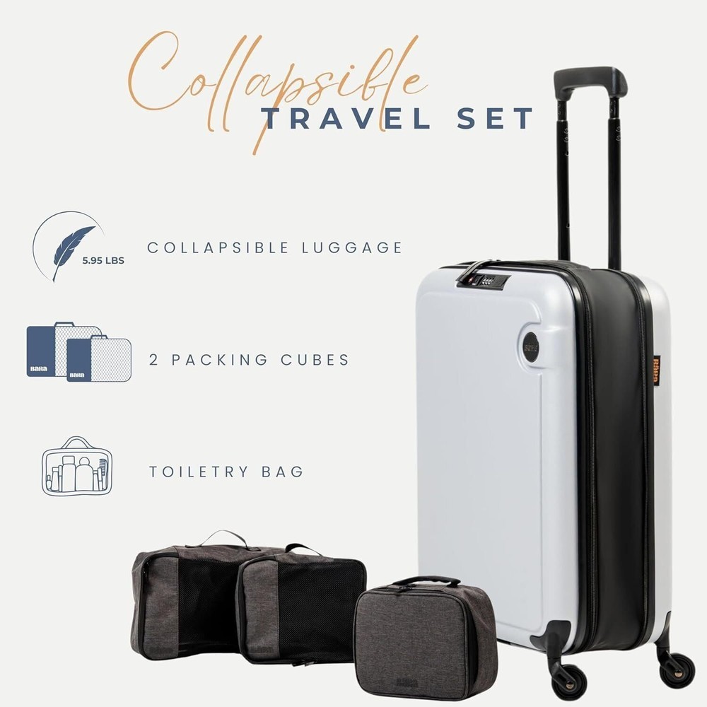 Unfolding your next adventure is more than just a tagline for us. It represents our commitment to providing you with a travel companion that enhances your exploration, inspires your curiosity, and simplifies your travel experience. Enabling effortless travel with innovation and convenience, BÄRA sets a new standard in lightweight TSA approved carry ons. Our mission is to enhance your journey by providing a versatile travel companion equipped with a built-in USB charging port with both USB and USB-C chargers, water bottle holder, 360-degree spinning wheels, and secure locking mechanism. Elevate your travel experience with the BÄRA Travel Set, a comprehensive solution designed to streamline your journey. This all-in-one set includes a Hardshell Collapsible 20 Inch Carry On Luggage, essential Packing Cubes, and a versatile Toiletry Bag, providing you with everything you need for organized and stress-free travel. The Hardshell Collapsible Carry On Luggage offers both durability and convenience, crafted from 100% ABS hardshell material to protect your belongings while featuring a collapsible design for easy storage. Maneuver through airports effortlessly with the 360° Spinner Wheels and height adjustable telescopic handle, ensuring smooth mobility from check-in to boarding. The included Packing Cubes are meticulously designed to maximize suitcase space and keep your belongings neatly organized, while the TSA Approved Toiletry Bag offers convenient storage for your essential toiletries with features like a built-in hook for hanging and multiple mesh pockets. Whether you're embarking on a weekend getaway or a long-haul journey, the BÄRA Travel Set provides the perfect combination of functionality, durability, and style to enhance your travel experience.