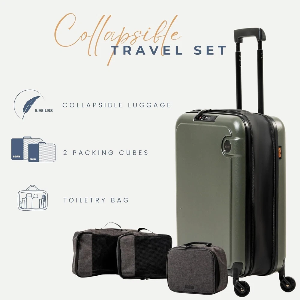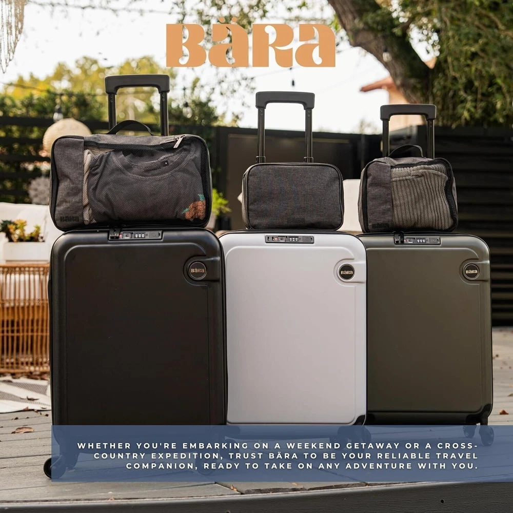 Unfolding your next adventure is more than just a tagline for us. It represents our commitment to providing you with a travel companion that enhances your exploration, inspires your curiosity, and simplifies your travel experience. Enabling effortless travel with innovation and convenience, BÄRA sets a new standard in lightweight TSA approved carry ons. Our mission is to enhance your journey by providing a versatile travel companion equipped with a built-in USB charging port with both USB and USB-C chargers, water bottle holder, 360-degree spinning wheels, and secure locking mechanism. Elevate your travel experience with the BÄRA Travel Set, a comprehensive solution designed to streamline your journey. This all-in-one set includes a Hardshell Collapsible 20 Inch Carry On Luggage, essential Packing Cubes, and a versatile Toiletry Bag, providing you with everything you need for organized and stress-free travel. The Hardshell Collapsible Carry On Luggage offers both durability and convenience, crafted from 100% ABS hardshell material to protect your belongings while featuring a collapsible design for easy storage. Maneuver through airports effortlessly with the 360° Spinner Wheels and height adjustable telescopic handle, ensuring smooth mobility from check-in to boarding. The included Packing Cubes are meticulously designed to maximize suitcase space and keep your belongings neatly organized, while the TSA Approved Toiletry Bag offers convenient storage for your essential toiletries with features like a built-in hook for hanging and multiple mesh pockets. Whether you're embarking on a weekend getaway or a long-haul journey, the BÄRA Travel Set provides the perfect combination of functionality, durability, and style to enhance your travel experience.