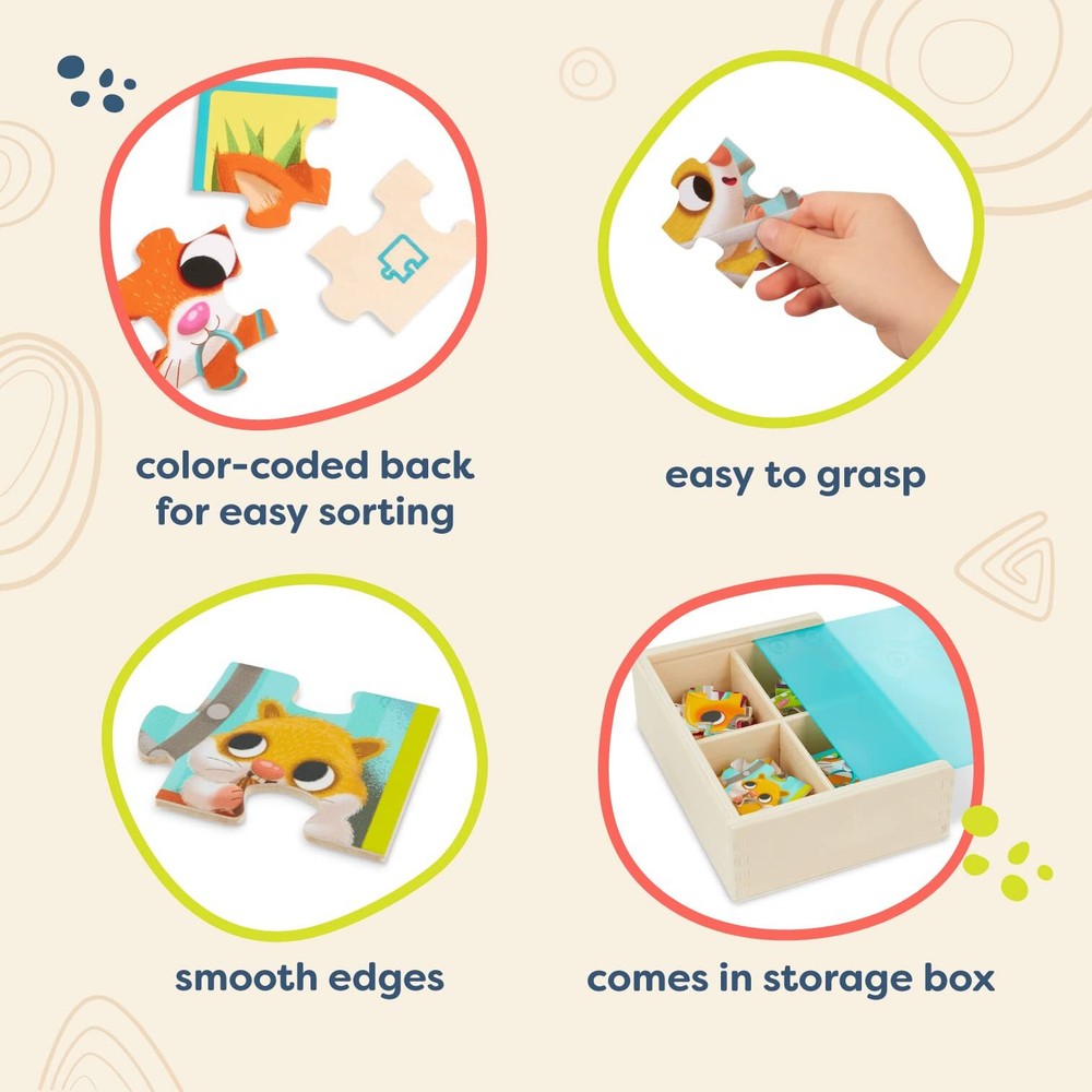 B. toys – Wooden Puzzle Set – 4 Animal Puzzles – Cat, Dog, Bird, Hamster– 12-Piece Jigsaw Puzzles For Kids – 3 Years + – Pack o' Puzzles - Pets Explore 4 fun puzzles with the Pack o' Puzzles - Pets set from B. toys! This kit includes 4 animal-themed puzzles and a sturdy wooden box that stores 'em all. Each puzzle comes with 12 easy-to-hold pieces and features a friendly pet – a cat, a dog, a bird, or a hamster. Not to mention, every jigsaw puzzle in the set is color-coded at the back for simple sorting! Solving these wooden puzzles not only comes with tons of fun, but playing with them can also develop dexterity, improve problem-solving skills, and teach kids about animals. Discover the full Pack o' Puzzles collection from B. toys to find more colorful puzzles for the little one in your life! Recommended for children 3 years and over. WOODEN PUZZLE SET: Discover four 12-piece puzzles that are made with little animal lovers in mind! INCLUDES: This set comes with 4 wooden puzzles that feature friendly animals – a cat, a dog, a bird, or a hamster. EASY PLAY: All of the pieces are tiny hands-friendly and each puzzle is color-coded at the back for easy sorting. SIMPLE STORAGE: Store all of the puzzles in the sturdy wooden box that comes with the set. AGE: This Pack o' Puzzles set is recommended for kids 3 years + Shipping from the USA All of our products are shipped from the USA, ensuring quick delivery to your destination. Payment We offer the following payment methods: PayPal, credit card, bank transfer, and eBay's secure payment system. Free Shipping & Free Returns Shipping within the USA is FREE. Additionally, any return is absolutely free for you. Risk-Free Purchase You have the option to return an item within 30 days without any justification. We cover the return shipping costs! Fast Shipping We ship immediately upon receipt of payment. Generally, the package is delivered within 2-3 days in the USA. If it takes longer, we will contact you. Quality and Costs Made in Europe, USA, China No customs fees or additional charges Total satisfaction guarantee Invoice with declared VAT available upon request in .pdf format Feedback Your feedback is very important to us. After you pay for your purchase, you will automatically receive positive feedback from us.