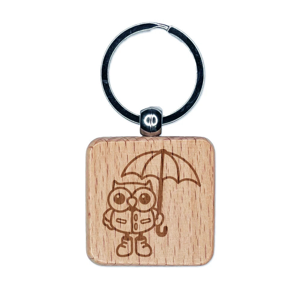 Búho con paraguas listo para la lluvia grabado en madera cuadrado llavero etiqueta dije