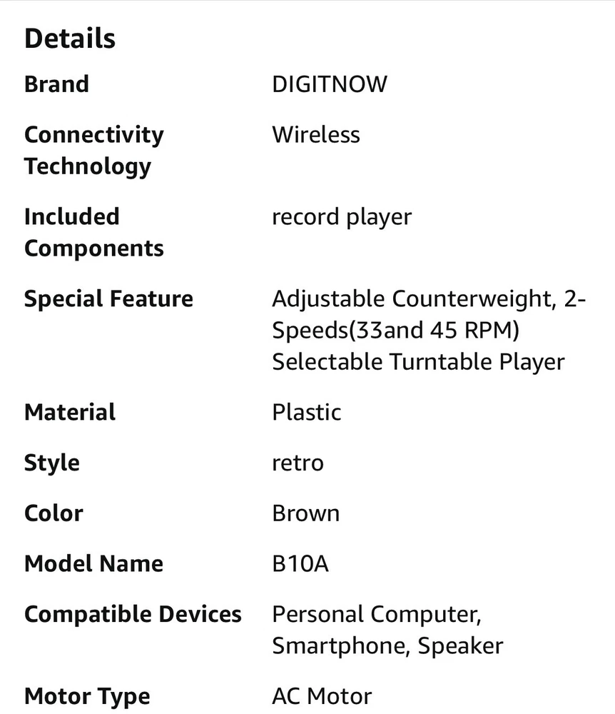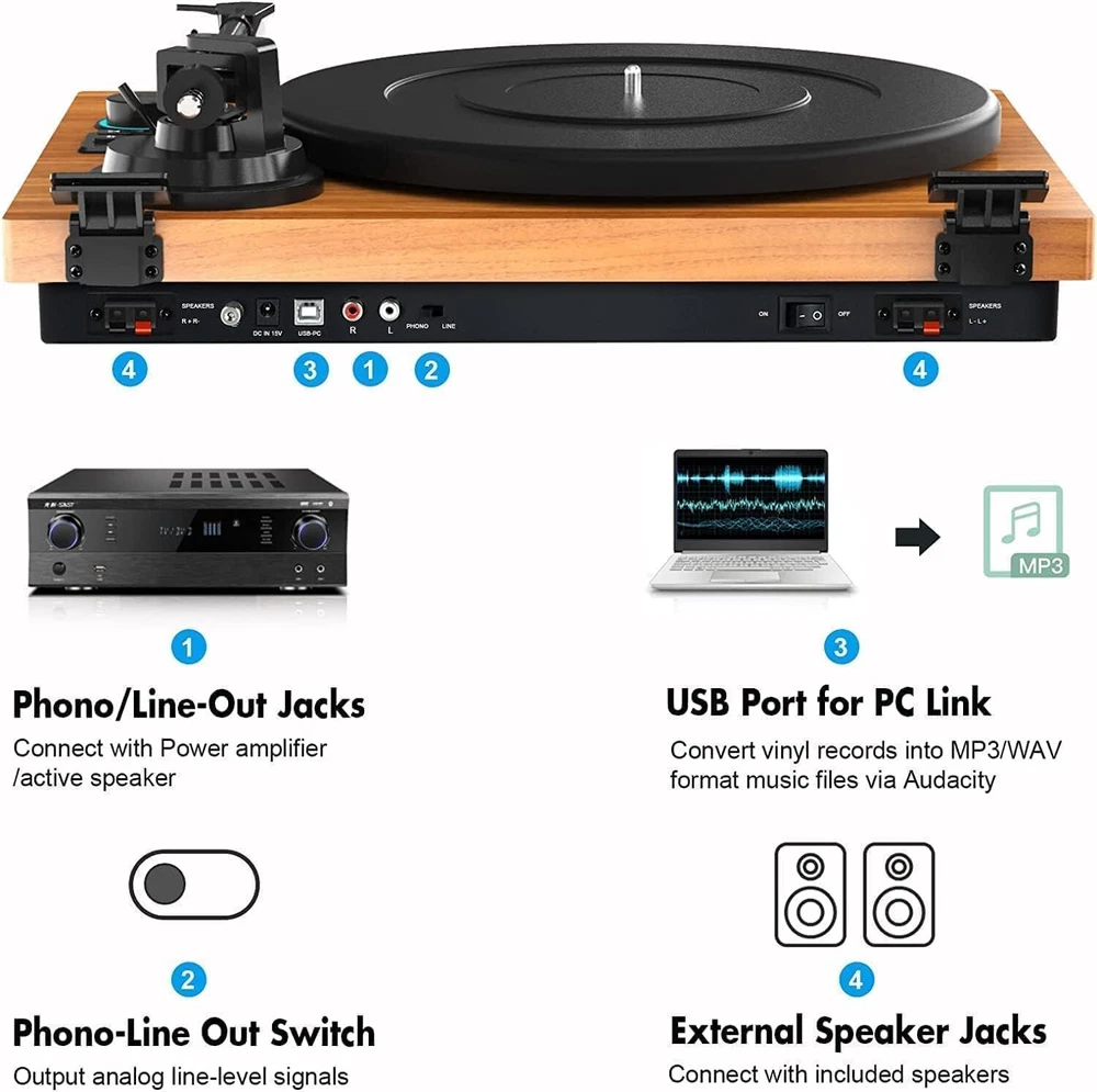 A Little Scratch Or Just Open Box Vinyl Record Player with Magnetic Cartridge & Adjustable Counter Weight,Wireless Bluetooth Turntable HiFi System with 36 Watt Detachable Speakers for High Fidelity Sound. F eatures & details [ Bluetooth Record Player ] - The wireless turntable with Bluetooth function supports playing all music from iPhones, Android smartphones, tablets. But not from Bluetooth speakers. [Adjustable Counterweight ]- Adjustable counterweight can ensure smooth Audio Technica AT-3600L movement out of skipping to keep clarity on musical peaks and avoid distortion, sharing your favorite musics with family happily. [Solid aluminum alloy platter ]-precision-manufactured aluminum alloy platter produces uniform inertial mass for perfect stability and rotation, Brings high-fidelity playback to the next level. [Vinyl to MP3 Recording ]- Convert turntable to MP3s via USB connection to Mac or PC, recording vinyl records directly to digital format in USB. Backup old vinyl in your PC or laptop. [Superior Record Player ]-built-in switchable phono line allows connecting to included Hi-Fi speakers or to your own externally speakers via the dual RCA output cables, ground wire also allow Connect the ground wire in your home with the ground wire of this product, which can reduce sound interference effectively.