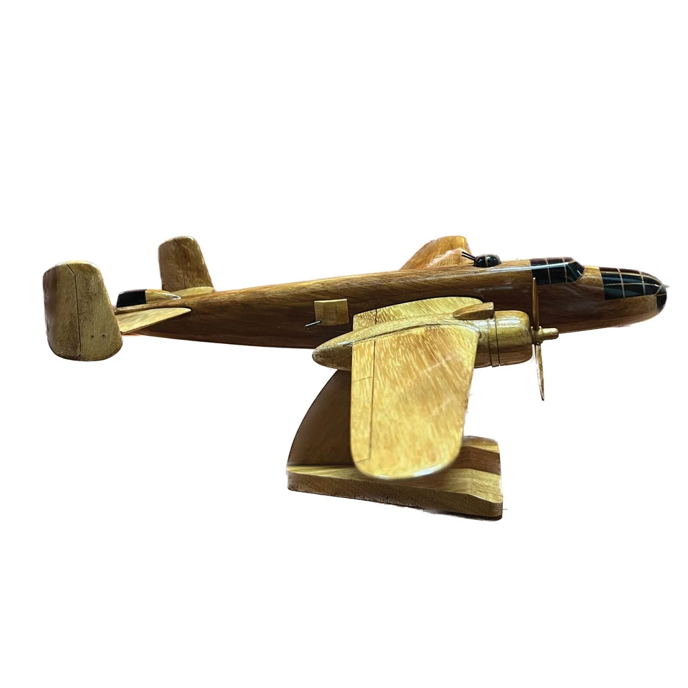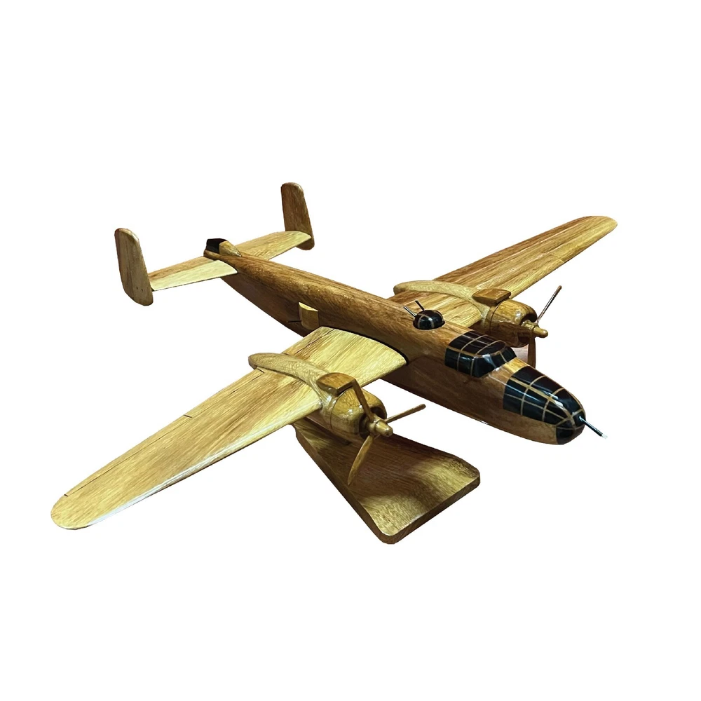 B25 Mitchell Mahogany Wood Desktop Airplane Model This desktop model is beautifully handcrafted out of reclaimed Mahogany Wood. Each unique piece is handcrafted with intense detail and finished with three coats of polyurethane coating that gives it a high gloss finish. Our desktop models are works of art that take many hours of labor to create. If you are a collector or simply want a fine art piece this handcrafted mahogany wood desktop model is sure to enhance your home or office. ADDITIONAL INFORMATION The North American B-25 Mitchell was an American twin-engined medium bomber manufactured by North American Aviation. It was used by many Allied air forces, in every theater of World War II, as well as many other air forces after the war ended, and saw service across four decades.The B-25 was named in honor of General Billy Mitchell, a pioneer of U.S. military aviation. By the end of its production, nearly 10,000 B-25s in numerous models had been built. These included a few limited variations, such as the United States Navy's and Marine Corps' PBJ-1 patrol bomber and the United States Army Air Forces' F-10 photo reconnaissance aircraft. MODEL SPECIFICATIONS B25 Mitchell SKU: B25MIT GENERAL DIMENSIONS BY MODEL TYPE Airplanes ( Wingspan: 16-18 inches) Helicopters ( Overall length: 16-18 inches) Cars & trucks ( Overall length: 12-16 inches) Motorcycles & Boats ( Overall length: 12 inches) Truck combos & Trains ( Overall length: 18-24 inches) In some cases Dimensions may vary depending on the model. If you want to know the exact size of a model please email us and we will confirm this with you. WHY OUR MODELS Handcrafted by master craftsmen using only the highest grade materials Our models are a fusion of art and history and a museum quality masterpiece. The perfect gift for any aviation enthusiast, history buff, military personnel, Automobile enthusiast, or collector. Most importantly; We can custom create any model of your choice. HOW THEY ARE MADE Each of our desktop models is hand-carved out of reclaimed mahogany and other fine woods by our seasoned model builders to bring a faithful scale reproduction of your favorite aircraft. More than mere displays. These models serve as family treasures that could be passed on to the younger generations. You will surely appreciate the craftsmanship and history behind our models. We use leftover wood from the furniture manufacturing industry. No trees are purposely cut for our wooden models. Our wooden desktop models are not always made to a specific scale but rather they are made so that you can easily fit and display them on your desk or bookcase. Our crafters are highly skilled artists that take great care in making our beautiful replicas to perfection. Due to color variations on the wood we can not guarantee that the color consistency will always be the same. We ship the models semi-assembled and some simple final assembly may be required. The wings for the airplanes and the blades for the helicopters will have to be plugged in but no glue is required. We guarantee our models and if for any reason you are not 100% happy with the wood model you receive let us know and we will send you a replacement right away. KEY PRODUCT FEATURES 100% Handmade out of reclaimed wood There is 30+ hours of work on each model Each model is unique so no two models are exactly alike Comes finished with high gloss Polyurethane. SHIPPING DETAILS ***INTERNATIONAL CUSTOMERS READ BELOW PLEASE WE OFFER FREE SHIPPING ON ALL DOMESTIC ORDERS WITHIN THE USA. We ship all stock models within 3-7 days from the day you place your order. Transit time is from 5-7 days depending on your location. Please allow 2-3 days in addition for processing time. We ship all custom models within 8-10 weeks from the day you place your order. Transit time is 7-10 days depending on your location. Please allow 2-3 days in addition for processing time. ***FOR INTERNATIONAL ORDERS. Yes. We can ship internationally but you must send us a message first with a link to the product (s) you want to order from our website and we will send you a quote for shipping. If you agree we then create a custom link for your order so you can place the order. You must provide us with a phone number for the shipping company after you place the order as we can not ship Internationally without a phone number. Allow an extra 7-10 days for delivery beyond the regular shipping time. WE ARE NOT responsible for any additional fees that may be incurred by Customs at destination. We urge you to check with your local postal service in your respective country before you order. In the event you do not claim your merchandise and it is returned you will be responsible for the shipping costs and restocking fees and any additional fees incurred while the merchandise gets returned. Please do provide us with a good phone number when you place your international orders in order to include it in the shipping documents as we can not ship without a phone number. WE THANK YOU ! We thank you for taking the time to view our crafts. We are blessed by customers like you who support our small business. From the Master Craftsmen and women that pick the wood and create the wonderful models you see to the people that make it possible for you to view our items on the web. We are grateful and we THANK YOU!. God bless you.