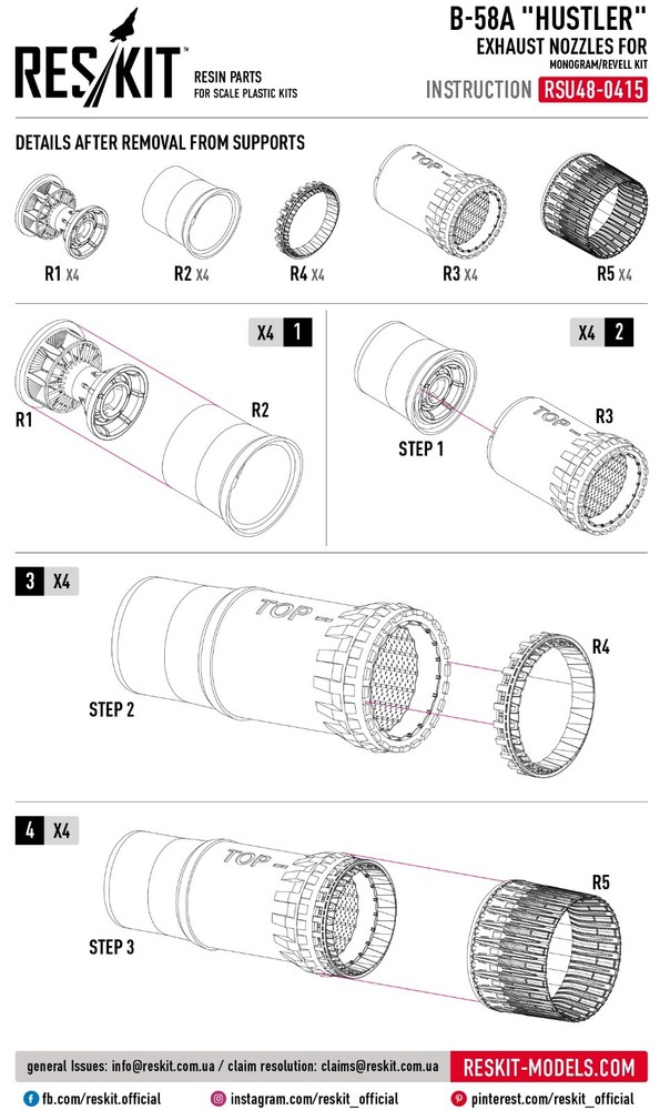 B-58 "Hustler" exhaust nozzles for Monogram/Revell kit (3D Printed) ResKit RSU48-0415 - for Plastic Model Kit Enhance Your Scale Models with ResKit | High-Quality Resin & 3D-Printed Accessories RESKIT - Accessories for Scale Plastic Kits Upgrade your scale model collection with high-quality resin parts from ResKit. Our Ukrainian-made parts are meticulously crafted to provide the most accurate and detailed representation of original components. Whether you're building aircraft, helicopters, military vehicles, or figures, ResKit has the perfect parts to enhance your project. Scale: 1/48 Manufacturer: RESKIT (Accessories for Scale Plastic Kits) Country/Region of Manufacture : Ukraine Condition : New in Box Category: Resin & 3D accessories Type of equipment : Aircraft Type of product: Exhaust nozzles Recommended kit: Monogram / Revell ResKit is a Ukrainian manufacturer of high-quality resin parts and accessories for scale models . The products are distinguished by a high level of detail and accuracy, which allows modelers to create the most realistic models of military equipment, aviation and other objects. Key Features: Premium Quality: Our resin parts are made with the finest materials and precision engineering. Extreme Detail: Experience unparalleled detail and realism in your models. Wide Range: Choose from a vast selection of parts for various scales and subjects. Easy to Assemble: Our parts are designed for easy integration into your existing model kits. Superior quality! ResKit parts allow you to create a model with incredible detail. ---------------------------- >>> Visit our eBay store! <<< You will find everything you need at great prices. Scale model accessories are a wide range of parts, spares, and components that can help you make your model even more realistic and detailed. In our catalog, you will find everything you need to assemble and repair model cars, airplanes, ships, tanks, and weapons. Our accessories are made from high-quality materials and meet all standards. We offer a wide range of models and sizes so you can find what you need. Buy scale model accessories in our store and make your model even more unique!