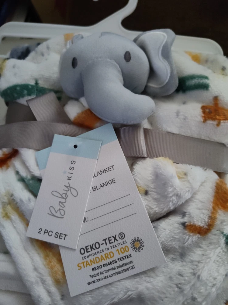 This adorable Baby Kiss elephant blanket set is perfect for snuggling up with your little one. The reversible design allows for versatility in how you use it, and the Oeko-Tex certification ensures that it is made with high-quality materials that are safe for your baby. The multicolor design is playful and gender-neutral, making it a great choice for any baby's nursery. The set includes a cozy blanket that is perfect for naptime or chilly evenings, as well as a lovey that is perfect for snuggling up with your baby during feeding time or naps. The elephant theme is cute and engaging, and the unisex design makes it a great choice for any baby's collection. With this Baby Kiss blanket set, you can rest easy knowing that your baby is safe and cozy.