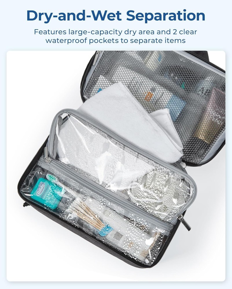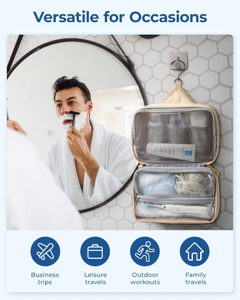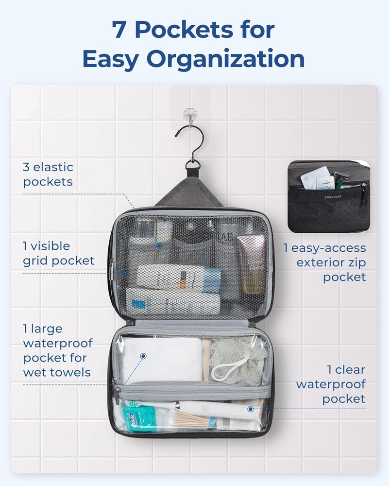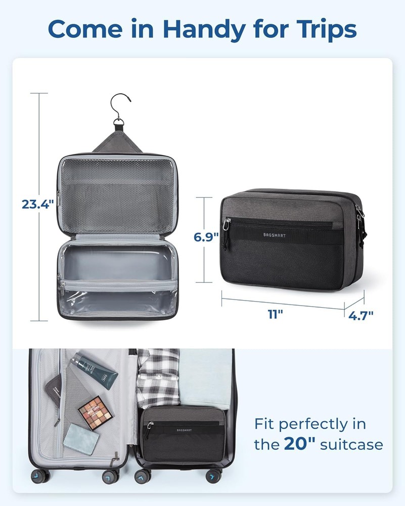 BAGSMART Toiletry Bag for Men/Women, Travel Organizer Dopp Khaki Product Details Product Dimensions: 11.02 x 6.89 x 4.72 inches Item Weight: 10.5 ounces Department: Unisex Adult Country of Origin: China Large Capacity & Easy Organization: Measuring 11.02 x 6.289 x 4.72 inches, this toiletry bag boasts ample space with well-designed compartments, including three mesh pockets and a large section for essentials like face wash and shampoos. Made from durable, water-resistant PVC mesh, it features a zippered closure for secure storage and easy cleaning Wet-Dry Separation Design: This toiletry bag features a dual-compartment lower section for optimal organization. The spacious main compartment is perfect for wet items such as towels and bath products. A waterproof zippered pocket keeps essentials like toothbrushes and toothpaste secure. An additional external pocket offers quick access to small items like your smartphone, ID, wallet, or band-aids, ensuring convenience and efficiency Premium Material: This toiletry bag is crafted from robust polyester fabric for unmatched durability. Equipped with high-quality metal zippers and nylon cords, it offers a smooth glide for effortless opening, even when your hands are wet or soapy. Travel Convenience: This toiletry bag boasts a 360° swivel hook for easy hanging in any setting, including bathrooms and gym lockers. Made with water-resistant fabric, it protects your essentials from moisture. The robust side handle enhances portability, making it ideal for travelers. Versatile Use: Perfect for men and women, this stylish toiletry bag suits gym sessions, travel, business trips, or daily use. Its practical design makes it an ideal gift for occasions like Valentine's Day, Father's Day, Christmas, and New Year's.