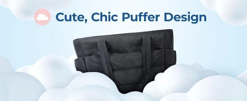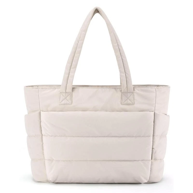 Puffer Tote Bag Compact Size: Size: 19.3'' x 6.3'x 13.8'', Capacity 20L. The quilted tote bag suitable daily necessities such as 15.6'' laptops, Umbrella, water cup, power banks, clothes, shoes, etc. The zipper closure design ensures the safety. Multi-pocket: The women tote bag feasures many separate pockets. 1 multiple layer main compartment can easily hold 15.6'' laptop computer, A4 folder, clothes, etc. 2 side widen pocket + 1 front pocket allow you quick access the items you need. Ultra Lightweight Material : Weighs only 0.99 pounds. Made of durable, soft and light taslan fabric. The puffer tote bag is easy to carry. Good choice of travel bag.