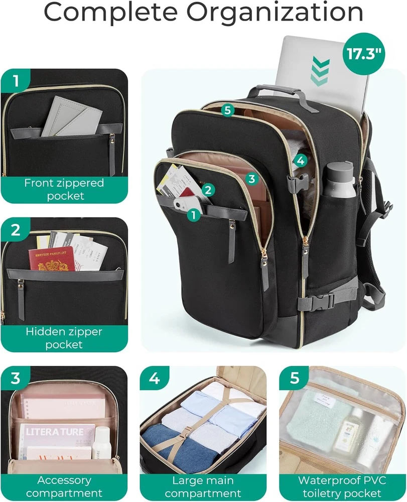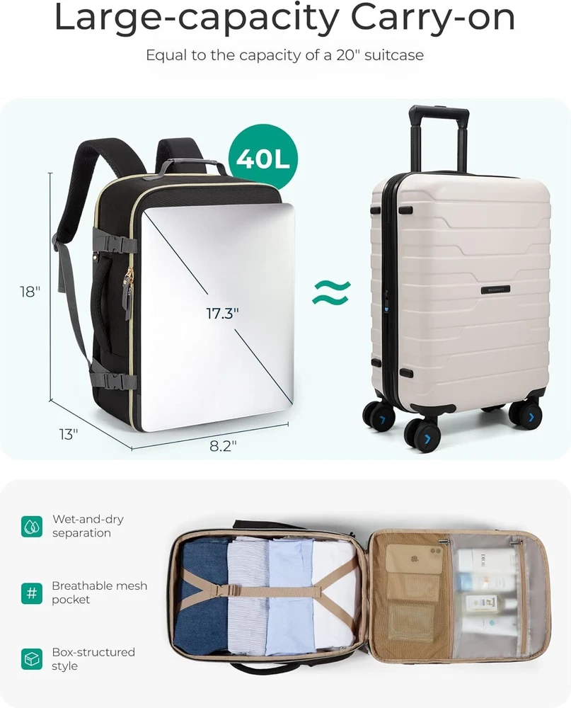 BAGSMART Travel Backpack for Women, Large Personal Item Bag, 40L Beige Product Details Product Dimensions: 8 x 13 x 18 inches Item Weight: 1.83 pounds Department: unisex-adult Age Range Description: Adult Number Of Items: 1 Capacity Total: 32 Liters 【Fashionably Functional Design】Elevate your travel style with a travel backpack carry on flight approved that blends fashion and functionality. Crafted from sturdy, scratch-resistant materials, this women's suitcase for travel stands out for its durability and chic appearance, making it perfect for modern female travelers who value both style and substance 【Ample Storage with 40L Capacity】Whether you're off for a weekend getaway or an extended trip, enjoy the spaciousness of 40L capacity. This carry on backpack accommodates everything from multiple outfits to tech gear, including a dedicated compartment for a 17.3-inch laptop. It's designed to meet the packing needs of dynamic female travelers who require versatility and organization 【Advanced Cleanliness Solutions】Maintain impeccable hygiene with an integrated antimicrobial lining in the wet bag of travel backpack for women. Crafted from premium waterproof material, it efficiently separates damp items or toiletries, safeguarding the rest of your belongings from moisture and odors 【Streamlined Travel Compliance】Navigate airports seamlessly with a travel backpack that meets optimal carry-on dimensions (18 x 13 x 8.2 inches). Compliant with major airline guidelines, it fits effortlessly into overhead compartments and under seats, ensuring hassle-free travel transitions.This personal item travel bag is also great for college, work, business and outdoor activities 【Ergonomic Comfort and Durability】The backpack for women features experience superior comfort with ergonomic, breathable shoulder straps and reinforced stitching for durability. Designed to endure extensive travel while providing ergonomic support, it's tailored for the active lifestyle of today's female travelers