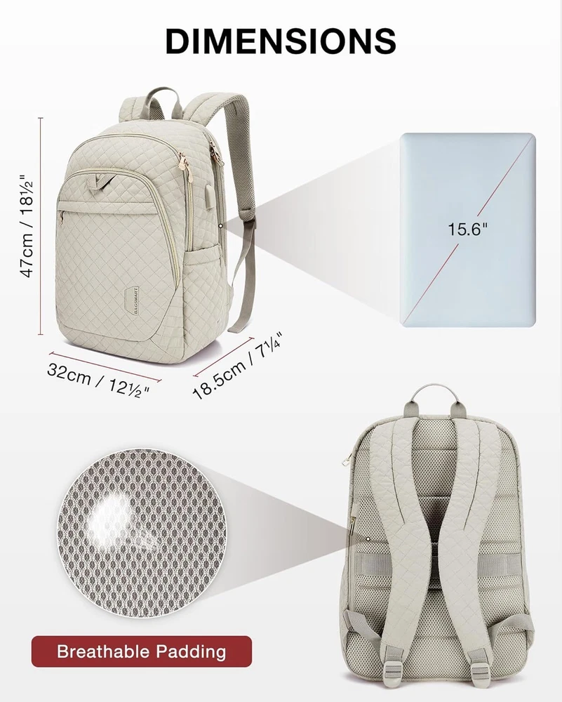 BAGSMART Travel Laptop Backpack Women, 15.6 Inch Anti Theft Beige Product Details Standing screen display size: 15.6 Inches Large Capacity: Dimensions 18.5 * 12.5 * 7 inches, The laptop backpack has multiple divider pockets, The laptop compartment with anti-theft zippers is suitable for a laptop up to 15.6", padded with EVA foam can offer optimal protection for your laptop. Tablet slot fits up to 12.9’’ iPad. Mesh pockets for mouse, adapter, and charging cord. Large main compartment roomy for daily necessities, such as A4 folders, textbooks, magazines, chargers, power bank and clothes Convenient Pocket: Front zippered pocket of the travel backpack allows you to put your small items in an organized manner. With a hidden anti theft pocket on the back protect your valuable items from thieves. Side pockets for water bottle or umbrella make your items organized and easier to find Comfy & Convenient: Ergonomic shoulder straps with a breathable mesh back panel can relieve pressure on the shoulders. Durable handles makes you more comfortable when gripping the back pack. Luggage strap allows backpack to slide over the luggage tube for easier carry-on travel USB Charging Port: With an inside charging cable and an outside USB port, the backpack offers an easy way to charge your devices. No need to keep power bank on the hand while walking or cycling. Also offers easy access to earphone usage Long-lasting Durability: BAGSMART bookbag for women is really brings out the best of our quilting process. Metal double-way zippers make opening/closing simple and fast. Many padding on the back and 2 ‘S’ curve padded shoulder straps make it comfortable to wear. The luggage strap ensure the backpack stand upright and easy to slide. Bagsmart backpack made of durable polyester fabric, ensures long-lasting usage