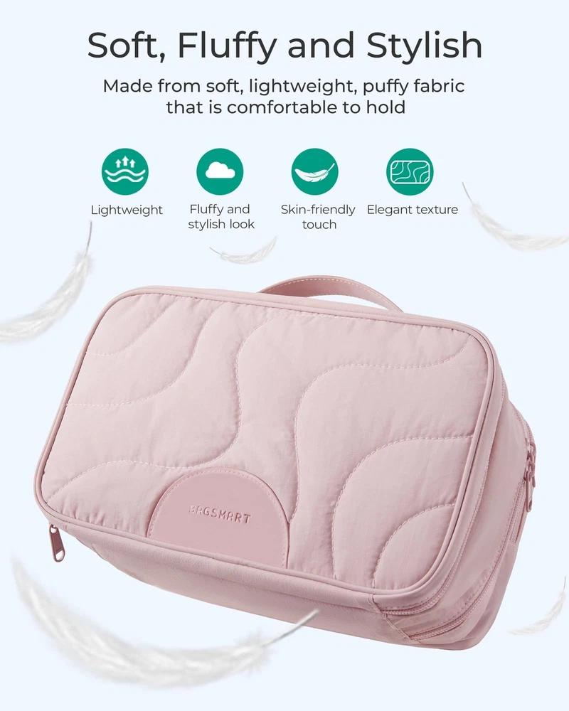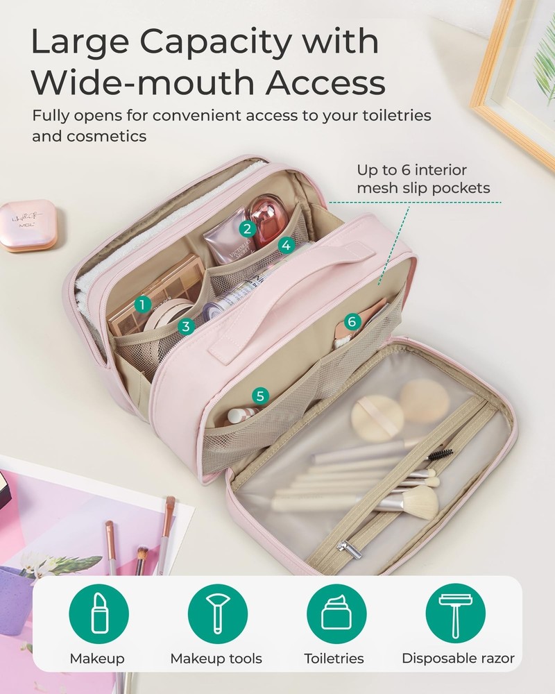 BAGSMART Toiletry Bag for Women, Wide-open Makeup Bag Organizer for Travel Essentials Travel-size, Water-resistant Large Capacity Cosmetic Bag for Accessories, Shampoo, Toiletries with Handle, Black Product Details Color: Black Brand: BAGSMART MPN: Does not apply UPC: Does not apply EAN: Does not apply Product Dimensions: 10.63 x 6.5 x 6.1 inches Item Weight: 8 ounces Department: Unisex Adult Country of Origin: China Spacious & Organized Storage: This toiletry bag (11.22 * 5.31 * 6.89 inches) features a thoughtfully designed multi-compartment layout with 3 zippered pockets. The main compartment is spacious enough to fit large bottles of toiletries and cosmetics, while 4 mesh pockets keep smaller items like face masks, eye creams, and lip balms neatly organized. Two additional pockets ensure dry and wet items are kept separate for optimal organization Dry & Wet Separation Design: The front and back pockets offer perfect dry and wet separation. The front pocket includes 2 mesh pockets for items like lipstick, mascara, nail polish, and medications, as well as a PVC pocket for makeup brushes and sponges. The back pocket is ideal for towels, toothbrushes, toothpaste, and other wet items Quick & Easy Access: The wide, full-opening design provides easy access to your toiletries and cosmetics, allowing you to quickly find what you need. When it's time to pack up, simply zip it shutno more digging through clutter. Everything is neatly organized and in its place! Premium Materials & Details: Crafted from soft, lightweight, and durable fabric, this toiletry bag offers excellent protection for your belongings. The water-resistant fabric ensures it holds up to daily use, while the leather handle adds a sophisticated touch. Upgraded double zippers provide a smooth and effortless opening and closing experience. Versatile & Perfect Gift: Available in 4 stylish colors, this toiletry bag is your perfect travel companion, whether you're at home, on business trips, or hitting the gym. It also makes a thoughtful gift for any occasionChristmas, New Year, Mother's Day, Valentine's Day, birthdays, or just because. Ideal for wives, girlfriends, or anyone special in your life