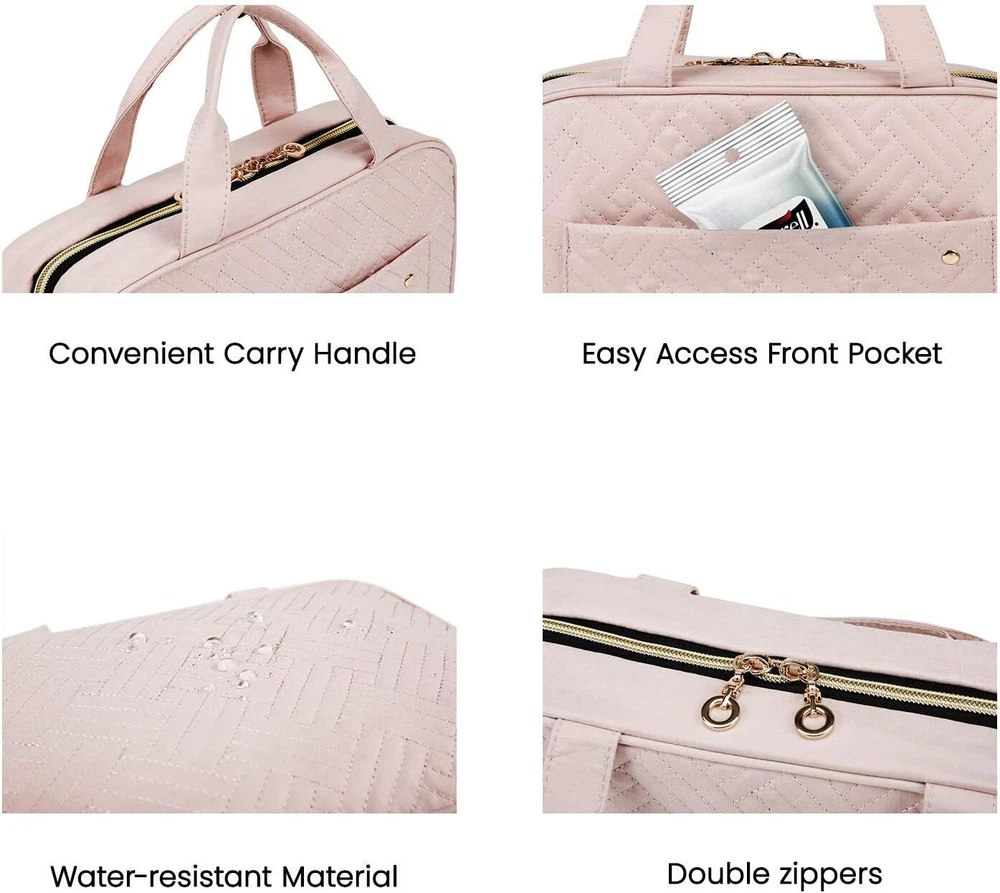Dimension: Medium-10.8'‘L x 3.5"W x 7.9H(folded); Large-12.6'‘L x 4.5"W x 9H(folded); 4 separate compartments with zip and back open pocket for great organization. Suitable for your family trip to pack all men, women , and kids toiletries Special Design: Inner main pockets with elastic straps hold bottles upright; double zipper compartment for easy access to the items even not fully open the bag; Transparent sides for providing clear overview of contents Easy to Use: Stow-away 360-degree swivel non-slip metal hook for versatile hanging options; Two-way zipper closure for quick access; Carry handle doubles as its hanging strap Water-resistant for Wash Basin: Water: resistant Polyester peach skin with supple touch; Well-padded design to keep full bag's shape and provide great protection. It can hold many items with sturdy stitching and heavy-duty material Easy to Carry: Lightweight and easy to carry, great for overnight staying, a long journey, gym shower, and outdoor activities