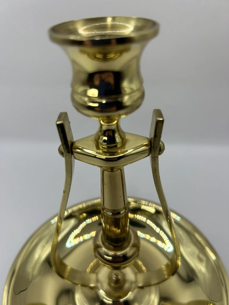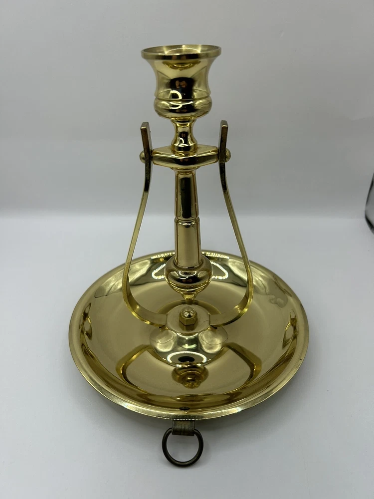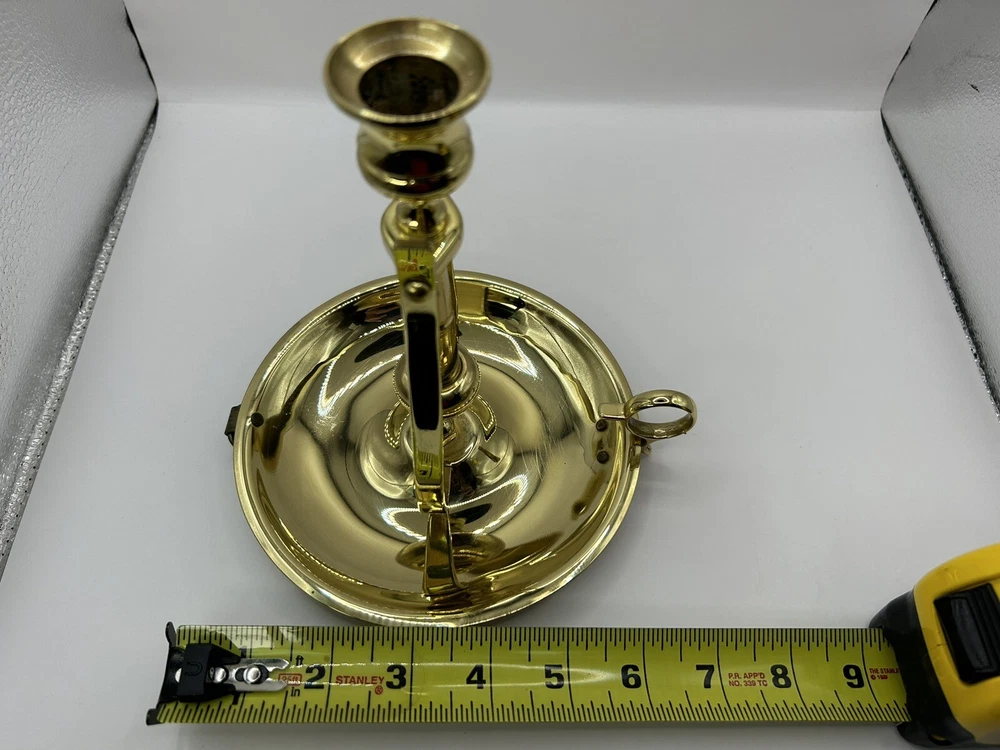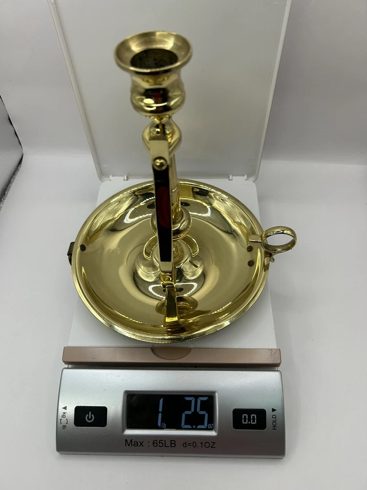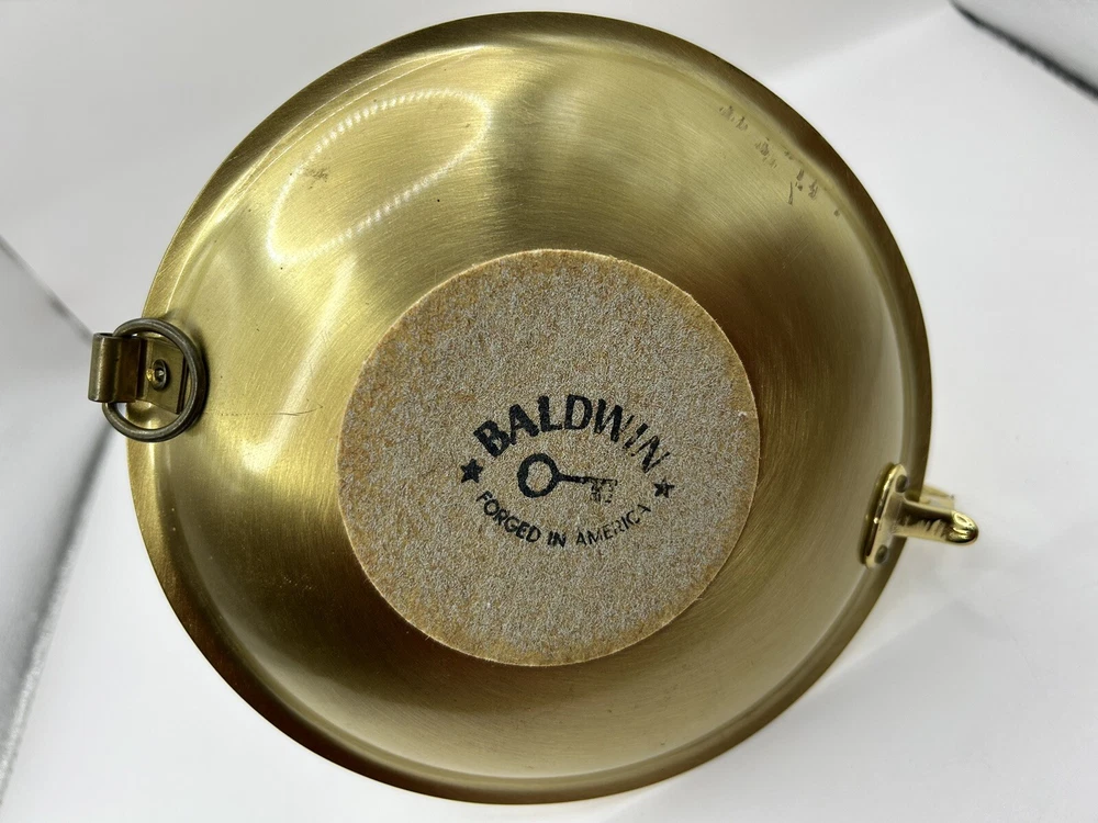 This is previously used and has some blemishes / scratches due to usage. No breaks or cracks. Add a touch of elegance to your home decor with this stunning BALDWIN Brass Chamberstick Candlestick. Crafted in the United States, this original piece features a polished brass finish and a nautical design that adds a unique charm to any room. The candlestick is medium-sized, measuring 7 inches in height and 6-1/8 inches in width, with a weight of 1lb 2oz. This beautiful candle holder is perfect for any occasion and is sure to create a warm, cozy atmosphere in your home. It features a hanging and swinging design that adds a touch of sophistication to your decor. The BALDWIN Brass Chamberstick Candlestick is a must-have for collectors and is an excellent addition to any decorative collection.
