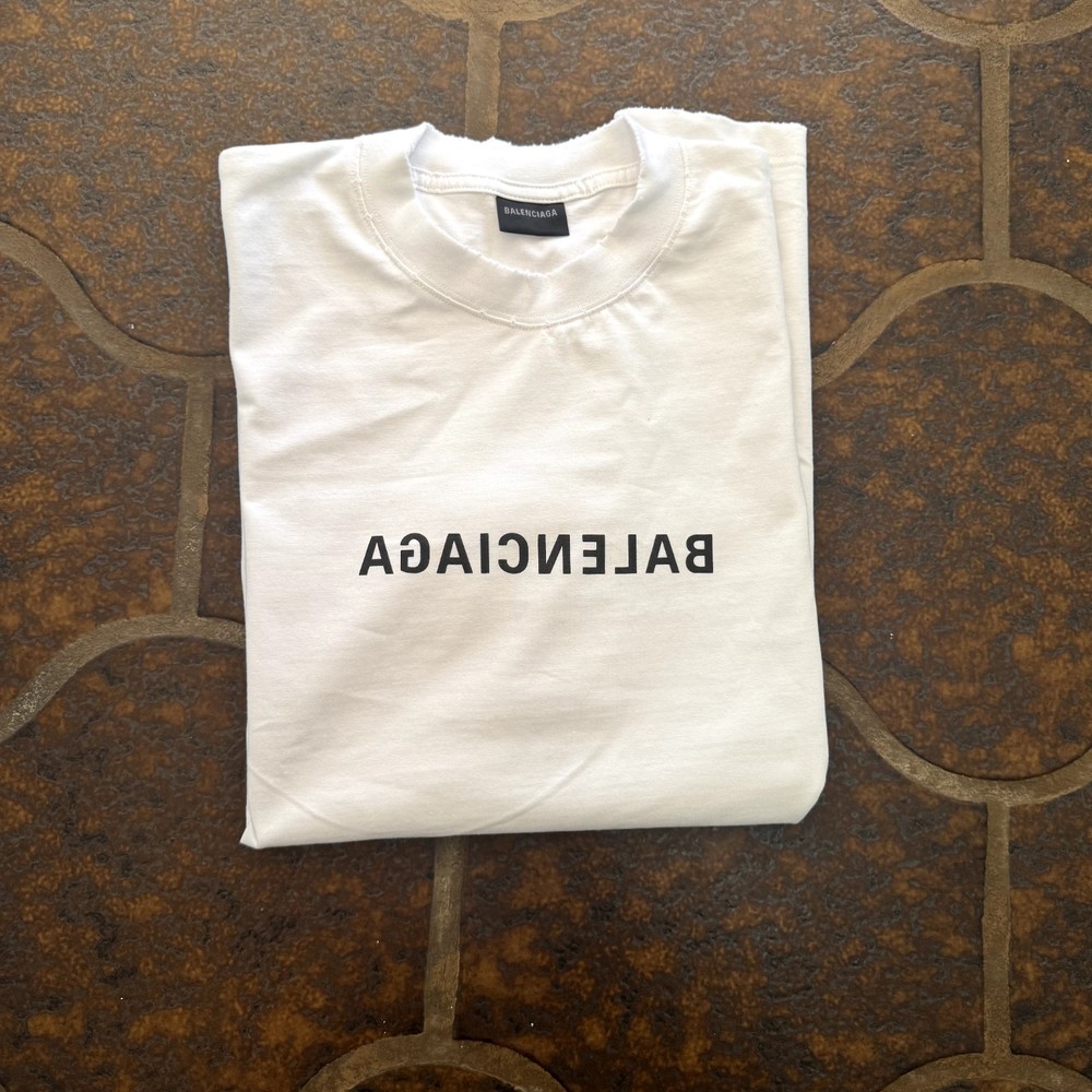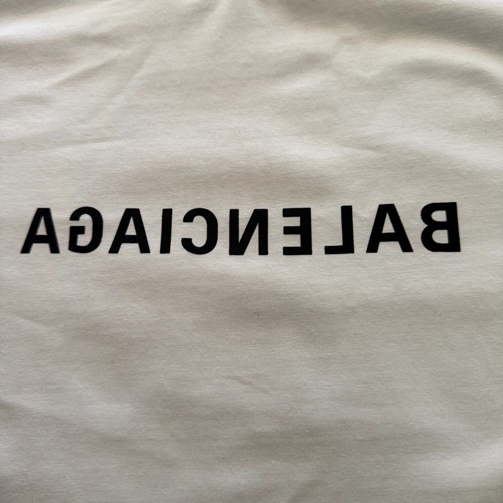 This shirt has only ever been worn once it's in great condition with no stains and still has its clean distressed style along each opening on the shirt. This will be carefully packaged and shipped the same day, The BALENCIAGA Reverse Logo Print White Men's T-Shirt in size LARGE features a solid white color with a crew neckline and short sleeves, made from lightweight cotton fabric. This relaxed fit t-shirt is adorned with the iconic Balenciaga logo as accents, perfect for a summer wardrobe. With its designer theme and oversized design, this t-shirt embodies a sense of adventure and style, making it a statement piece for any fashion-forward man.