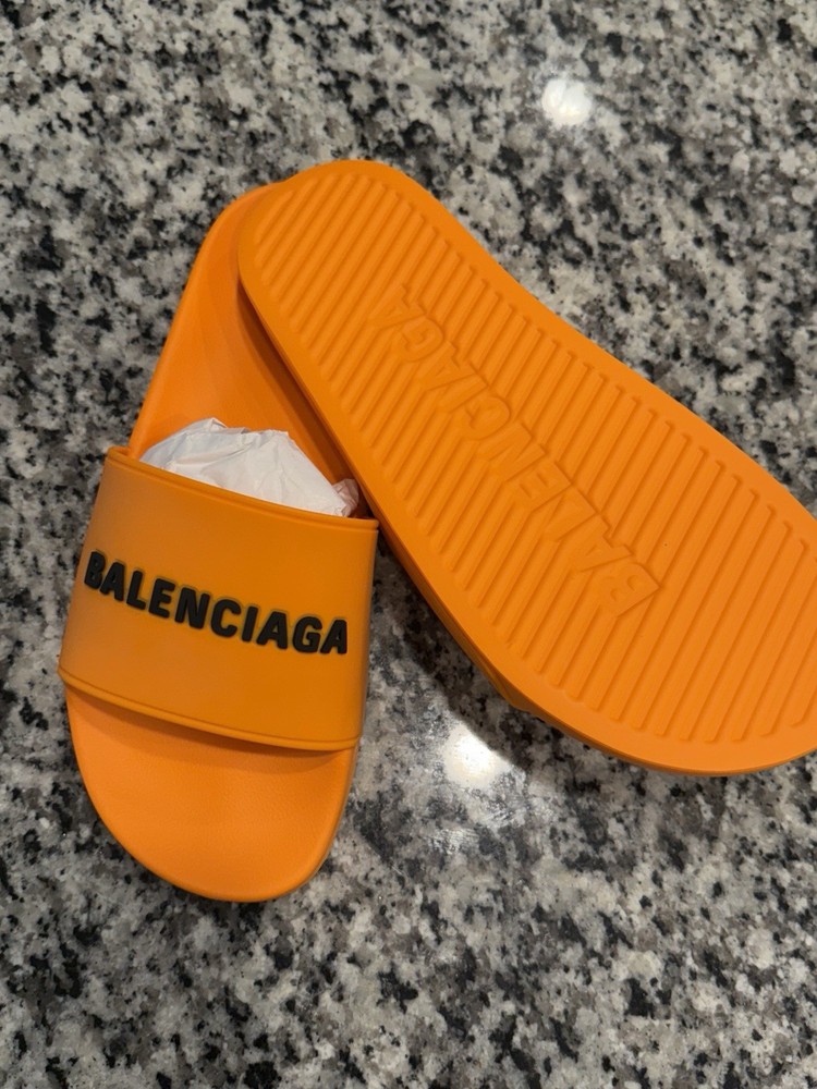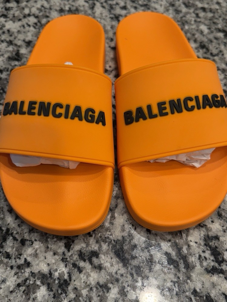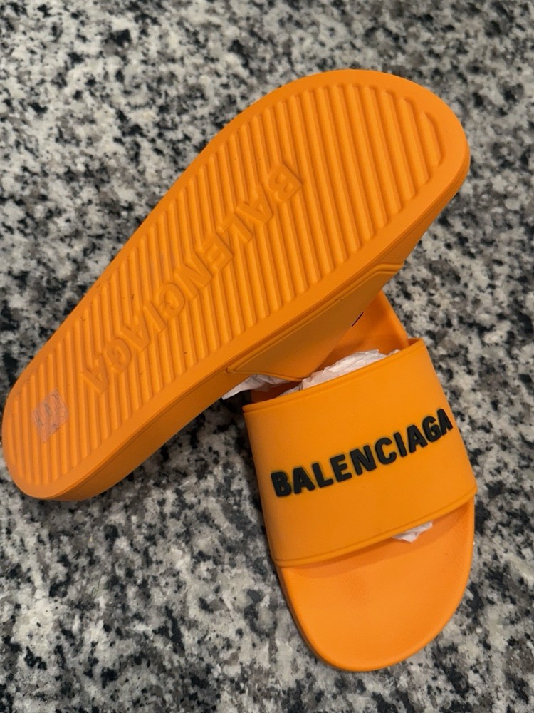 UK Shoe Size:7Customized:NoHandmade:NoUpper Material:RubberOccasion:CasualBrand:BALENCIAGAVintage:NoStyle:SlideColor:OrangeAccents:LogoTheme:LogoFeatures:ComfortUS Shoe Size:8Type:SandalDepartment:MenCountry of Origin:Italy