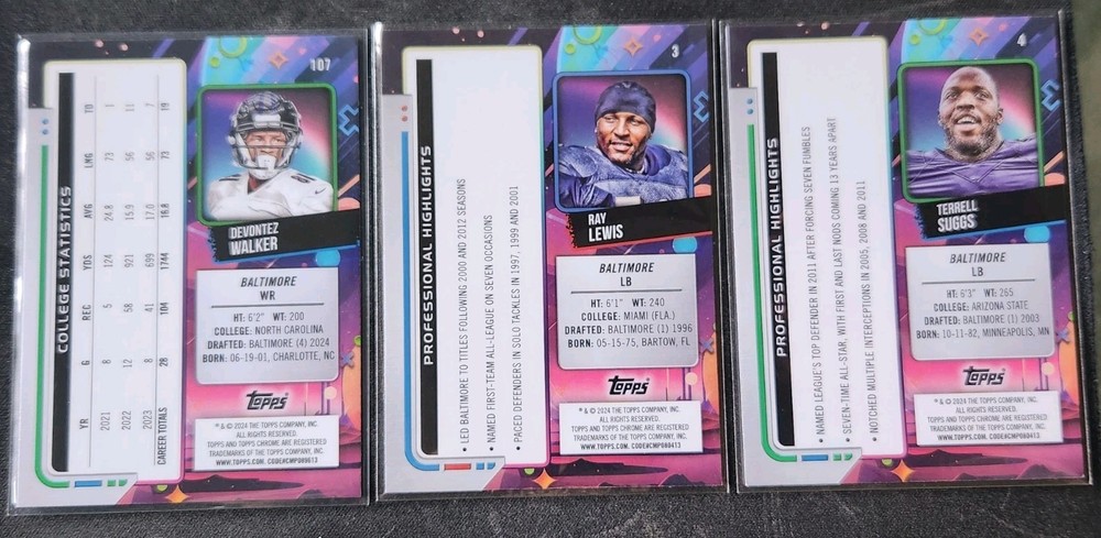 Manufacturer:ToppsPlayer/Athlete:DEVONTEZ WALKER, Ray Lewis, Terrell SuggsVintage:NoSet:2024 Topps Cosmic ChromeLeague:National Football League (NFL)Team:Baltimore RavensAutographed:NoType:Sports Trading CardYear Manufactured:2024Sport:FootballFeatures:Base Set, RookieNumber of Cards:3