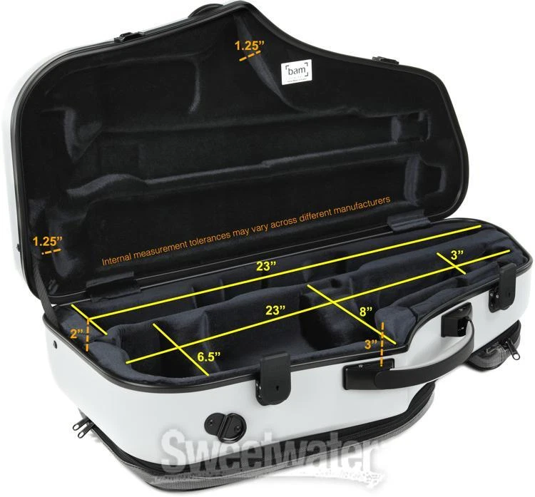 A Lightweight, Heavy-duty Sax Case BAM’s Hightech series of cases make for the ideal choice for transporting your instrument to practice and performances, boasting an innovative 3-ply exterior that seamlessly merges heavy-duty protection and lightweight portability! The BAM Hightech Alto and Soprano Saxophone Case features a cradle constructed from injected high-density polyurethane foam, a material that excels at acting as a cushion against impact and thermal shock from drastic temperature changes. Two neoprene anti-slip backpack straps, two side handles, and multiple small pockets make this case a breeze to transport for musicians with an active schedule. Couple those features with the male/female airtight seal and four soft-touch key latches, and the BAM Hightech Alto and Soprano Saxophone Case is a seriously durable piece of purpose-built hardware for the performing musician.Innovative 3-ply construction BAM’s Hightech series of cases boast a unique 3-ply construction to keep your instrument safe from bumps, impact, Sweetwater is an Authorized BAM Dealer Genuine New Item Sweetwater's 2-year warranty BAM 4120XL Hightech Alto and Soprano Saxophone Case - Light Grey Hightech Case for Alto/Soprano Saxophone with Airtight Seal and Integrated Latch - Light Grey A Lightweight, Heavy-duty Sax Case BAM’s Hightech series of cases make for the ideal choice for transporting your instrument to practice and performances, boasting an innovative 3-ply exterior that seamlessly merges heavy-duty protection and lightweight portability! The BAM Hightech Alto and Soprano Saxophone Case features a cradle constructed from injected high-density polyurethane foam, a material that excels at acting as a cushion against impact and thermal shock from drastic temperature changes. Two neoprene anti-slip backpack straps, two side handles, and multiple small pockets make this case a breeze to transport for musicians with an active schedule. Couple those features with the male/female airtight seal and four soft-touch key latches, and the BAM Hightech Alto and Soprano Saxophone Case is a seriously durable piece of purpose-built hardware for the performing musician. Innovative 3-ply construction BAM’s Hightech series of cases boast a unique 3-ply construction to keep your instrument safe from bumps, impact, and various elements. An ABS/Airex foam/ABS 3-ply layer provides the unyielding protection of a material like carbon fiber; however, as it contains no metal, BAM Hightech cases are far more resilient to temperature changes. For those who travel often, Sweetwater musicians find that BAM’s Hightech range of cases promise to keep your instrument in top shape! BAM Hightech Alto and Soprano Saxophone Case Features: Molded on a Selmer Mark 6 Alto Saxophone for wide-ranging compatibility Innovative Hightech 3-ply exterior (ABS/Airex foam/ABS) is lightweight and offers incredible protection from impact and temperature changes High-density injected polyurethane foam interior protects against impact and thermal shock Male/female airtight seal aids against thermal shock and prevents water damage Dedicated space to cradle both the neck and mouthpiece 2 neoprene anti-slip backpack straps offer hands-free portability 2 secure soft-touch key latches Specification Detail Type Alto/Soprano Saxophone Hardshell Case Internal Length 23.22" (Soprano), 20.86" (Alto) External Length 25.98" External Width 12.99" External Height 6.29" Interior Materials Polyurethane Foam Exterior Materials ABS Shell Handles/Straps 1 x Handle, 2 x Backpack Straps Pockets 2 x Exterior Weight 9.25 lbs. RETURN INFORMATION We want you to be completely happy with your purchase from Sweetwater. If you are not satisfied with your product, you may return it for a refund of the purchase price within 30 days. If your purchase was eligible for Free Shipping, the shipping cost will be deducted from your credit or refund. Returns must be in the complete and original packaging with all accessories and complete documentation (Owner's Manual, warranty card, quick start guides, etc.), show no signs of wear or use, and include a Return Authorization number or be subject to a restocking fee.