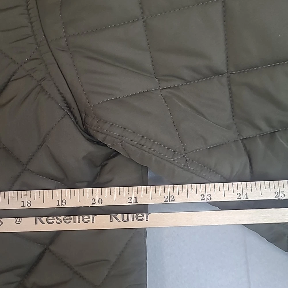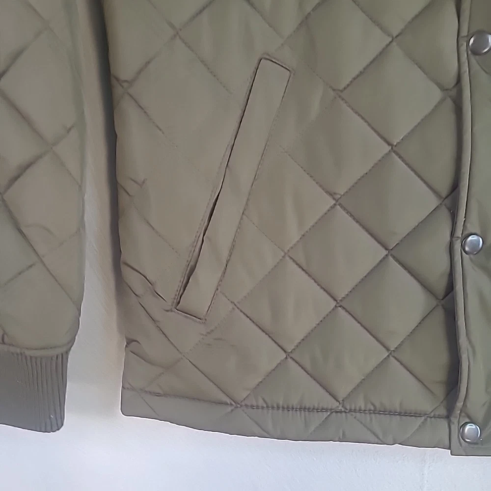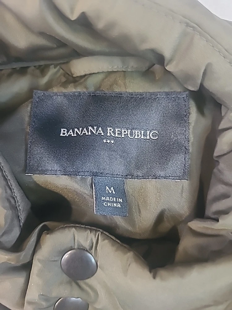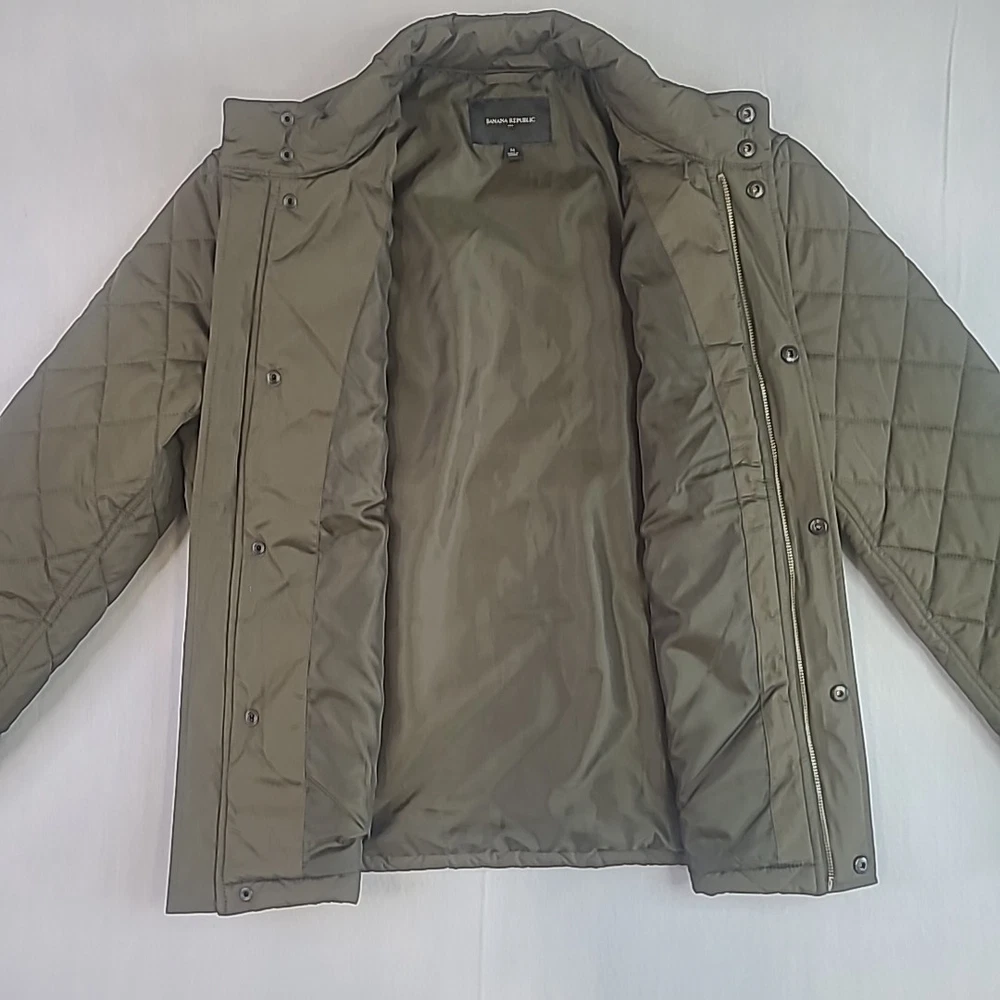 BANANA REPUBLIC Men's Diamond Quilted Puffer Jacket - Size M - Army Green Stay stylish and warm with this Banana Republic bomber-style puffer jacket. Designed with a diamond quilted pattern and filled for lightweight insulation, this versatile piece is perfect for layering through the fall and winter seasons. Features: Size: Men's Medium (M) Color: Army Green / Olive Style: Bomber Jacket Quilted diamond stitching for a classic, rugged look Front zip closure with snap-button placket Ribbed cuffs, collar, and hem for a snug fit Two front hand pockets & one interior pocket Lightweight and comfortable—perfect for everyday wear Material: Shell and lining – 100% polyester Brand: Banana Republic Condition: Pre-owned and in excellent condition with minimal signs of wear. No rips, stains, or holes. Clean and ready to wear. Measurements (approximate, laid flat): Chest (pit to pit): [Insert measurement] Length (collar to hem): [Insert measurement] Sleeve length (shoulder to cuff): [Insert measurement] 👕 Clean, smoke-free home 📦 Ships fast with tracking ✅ Trusted seller – buy with confidence!