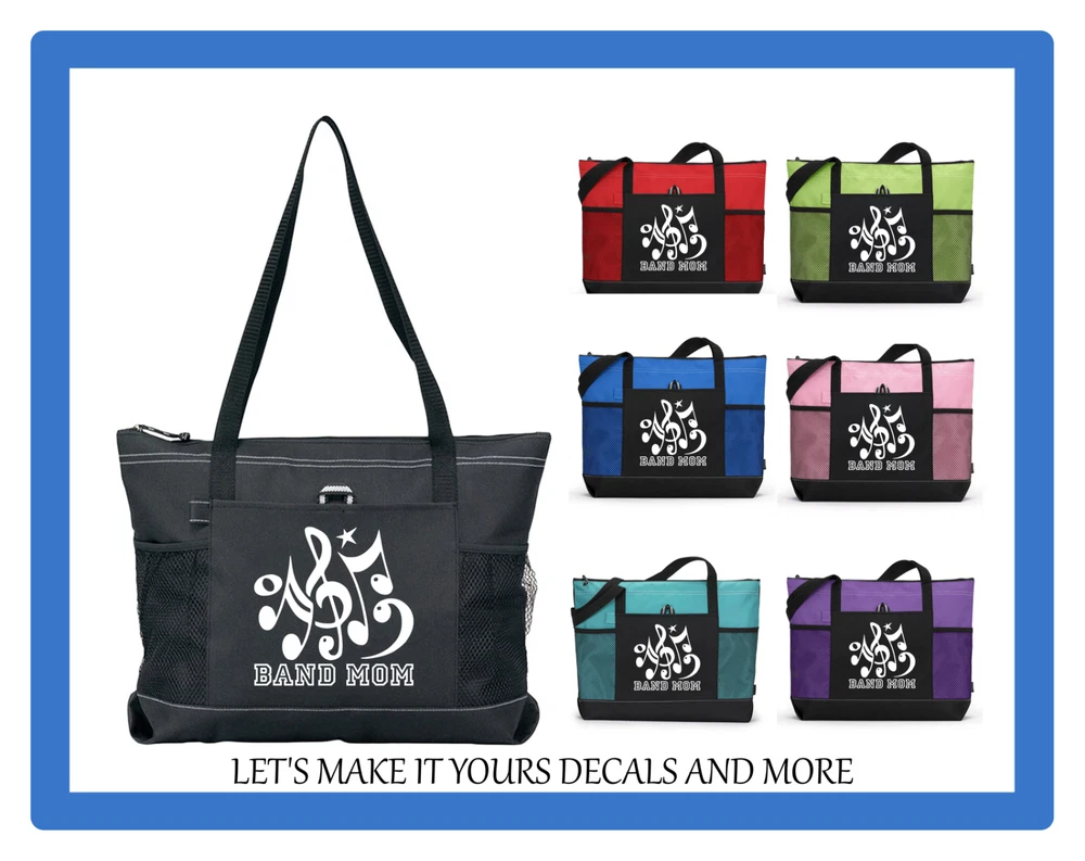 BAND MOM WITH MUSICAL NOTES DESIGN 2 YOUR CHOICE OF COLOR TOTE COLOR GEMLINE BRAND TOTE - VERY NICE AND DURABLE GREAT TO USE FOR OVERNIGHT BAGS, PURSES, TRIPS TO THE LAKE OR BEACH, CAMPING, USE AS A DIAPER BAG AND SO MUCH MORE THE DESIGN IS HEAT PRESSED VINYL AND WILL BE DONE IN WHITE BAG SPECS: 600-denier polyester 29½" Black webbing shoulder straps Zippered main compartment Front pocket with pen loop Two side mesh pockets Back panel is Black 20"W x 14"H x 4"D If you have a design request feel free to send us a message. We will work to see what we can do for you. Thanks! We try to ship out our items as quick as possible, but with made to order items it could take up to 5 days for the item to be completed and shipped. We thank you for your patience. DESIGN MAY BE SLIGHTLY ENLARGED TO SHOW DETAIL. DESIGNS WILL NOT EXCEED 6.5 INCHES EITHER IN WIDTH OR LENGTH. Be sure to fully examine all pictures closely and read auction completely prior to placing a bid. If you have any questions please be sure to contact me and I will do my best to answers them. I do combine shipping! Please note that our post office is closed on Sat & Sun so we can only ship Mon-Fri. Paypal is the only form of payment we accept at this time. If ever there is a problem please contact us prior to leaving bad feedback. We strive for a 5 star rating. Thank You :-) We sell a large variety of items. Be sure to stop in our store to see the other wonderful items we have to offer. From new to used to custom made. We do combine shipping!
