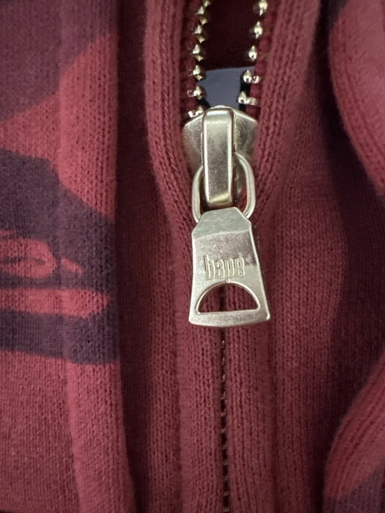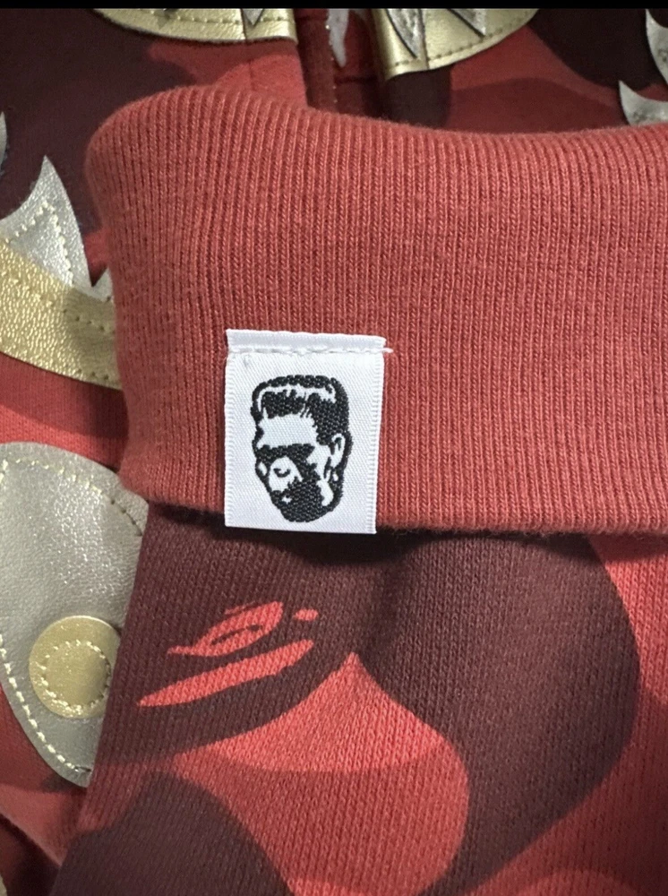 This BAPE Color Camo Double Shark Full Zip Hoodie in 'Red' is a designer streetwear piece for men. Made with high-quality cotton fleece material, it features a full zip closure, hooded design, and pockets for convenience. The hoodie is accented with a zipper, embroidered logo, and is a part of the Bape product line. It is available in XL size and has a regular fit. The hoodie is perfect for those who love colorful and unique designer pieces. It is made in Japan and is a great addition to any streetwear collection.