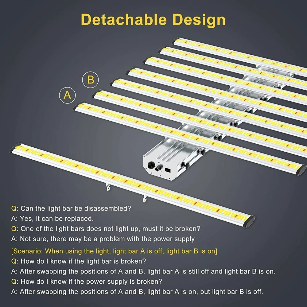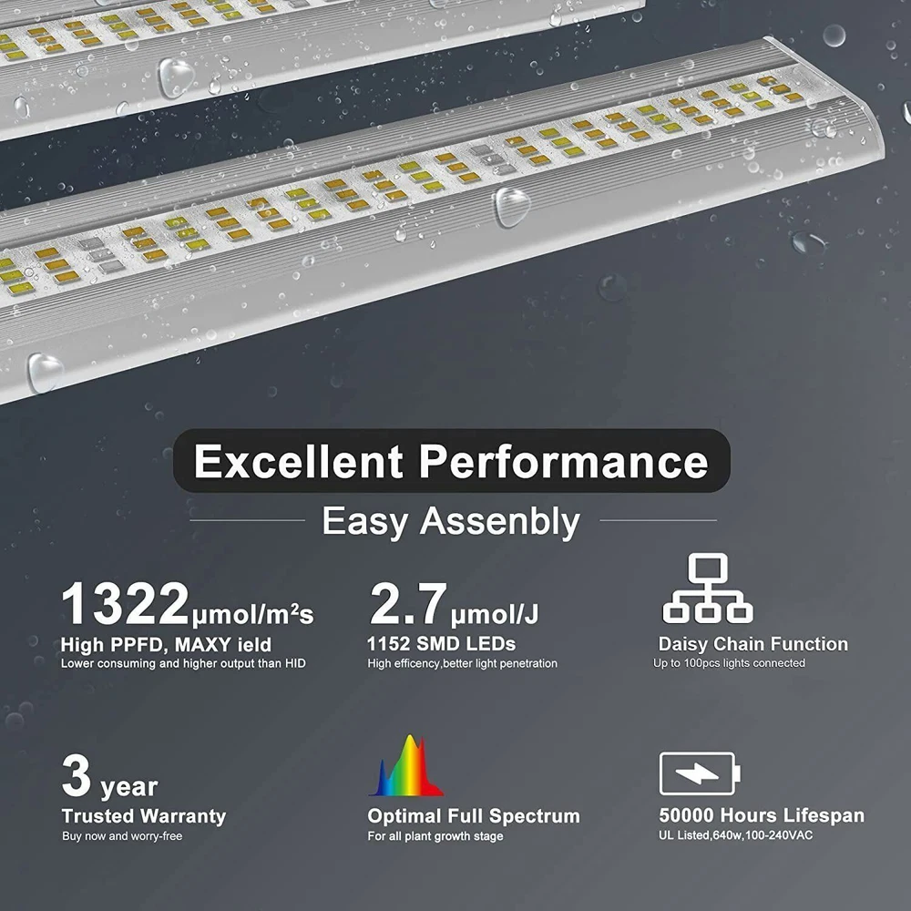 Likesuns Double Switch LED Grow Light Specifications: Power Actual consumption:320W±5% -Shell Material:Aluminum UV and Fire Protection -Warerproof Rate : IP65 -Power input:110-240V/AC,277V/AC,347-480V/AC,50/60Hz -Coverage Area :5X5FT VEG, 4X4FT BLOOM - Distance from the plants: ≤ 0,6 m (24") -Warranty :3 years -Light Distribution :120° -Thermal Management ;Passive -Dimming: 0-10V/PMW Indoor use only, not waterproof. Consumes less energy. Full spectrum gives plants everything they need in natural sunlight. Makes multiple harvests in one season possible. Extremely bright, avoid looking directly at the light, it's recommended to wear glasses when using. BAR-4000W Spider LED Grow Light 4x4ft Full Spectrum for Indoor Plant Hydroponics INCREASE YIELD AND CROP QUALITY : 2020 Newest SMD LED technology Sunlight Spectrum,uses Samsung 561C , ETL listed certified, actual power 400W, provides PPF output(994μmol/s), make you get 30% higher yield compare old purple led lights, to help you achieve maximum quality and quantity, which is much better than traditional grow systems. FRAME STRUCTURE - The most advanced design to effectively expand the light area. At the same time, the illumination is more uniform. This grow lamp is equipped with optical lenses on the LED beads, which makes the effective PPFD of our plant light improved, and it can also make the light more concentrated. EXCELLENT HEAT DISSIPATION DESIGN - No longer worry about heat dissipation even with high power. We adopt aluminum cooling plate made of advanced small molecular material, plus a small heat sink for each chip to achieve excellent heat dissipation. All of these designs made heat efficient dissipation. No fan, no noise. Dimmable & No fan , No Noise --dimming with different PPFD,Full spectrum LED added 660nm LED, good for all growth stage, especially for flower stage, high yield: >2.7grams per watt . WIDELY USED - This 8-light-bars grow fixture can be used for both hydroponics and indoor plants in soil, such as orchid, papers potatoes, lettuce, chili, tomatoes, aquarium plants like algae that in greenhouse, garden, vertical farm, grow tent or grow room. Even hotel, restaurant, office Dommia grow light can be installed wherever there are plants. BEST SERVICE - Phlizon is a professional LED grow light manufacturer with strong R&D team and many lights products. 24-month warranty and 30-day money-back guarantee. Product Features Phlizon Full Spectrum LED Grow Light bar designed specifically for use as supplemental greenhouse lighting, is a full-cycle top-lighting solution for commercial plants cultivation, with the power to scale from vegetative growth to higher light intensities in bloom. This light is very similar to the much more expensive Fluence SPYDRx, in that they both use Samsung chips and 660nm red light .But Phlizon bar light costs about half as much and gives you more power.Also 3 years warranty. Safety FCC ETL Certified and IP54 Rated.Passive cooling,extrusion pure aluminum can 100% ensure heat dissipation. Plants will grow better under the Full Spectrum LED Grow Lights, as well their yield. will increase hugely. Phlizon LED Plant Grow Light provides supplementation for your plants to grow fast and healthy! Using Samsung LM281b LED's provides an impressive luminous efficacy of 210 lm/W. Light bar reflectors are optimised for 120 degree dispersion providing more than 10% improved efficiency over glass, lens or foil based reflectors. highPAR lights use custom spec aluminium housed drivers with passiveventilation techniques for each individual light bar, this ensures higher energy efficiency (by not using fan forced cooling) without a compromise on reliability.The other advantage of this design is the individual drivers are easily interchangeable should they ever need to be replaced. grow lamp led plant light Package includes: 1 x Led grow light 1 x Power cord 2 x Adjustable rope 2 x Hanging hook kit 1 x User manual Likesuns Double Switch LED Grow Light Specifications: Power Actual consumption:320W±5% -Shell Material:Aluminum UV and Fire Protection -Warerproof Rate : IP65 -Power input:110-240V/AC,277V/AC,347-480V/AC,50/60Hz -Coverage Area :5X5FT VEG, 4X4FT BLOOM - Distance from the plants: ≤ 0,6 m (24") -Warranty :3 years -Light Distribution :120° -Thermal Management ;Passive -Dimming: 0-10V/PMW Indoor use only, not waterproof. Consumes less energy. Full spectrum gives plants everything they need in natural sunlight. Makes multiple harvests in one season possible. Extremely bright, avoid looking directly at the light, it's recommended to wear glasses when using. Advantage: High Efficiency Optimized for PAR, Extremely Sufficient Lights Spectrum, Super Light Penetration Plants grow faster and flower bigger: Enhanced spectral output covering full PAR (400-730nm) promotes photosynthesis for Growth & Bloomming, High Efficiency Powerful LEDs, Low Energy Consumption High performance aluminum alloy light bar, Fast heat dissipation, Uniform illumination , life span up to 50000 hours. Built-in aluminum alloy no stroboscopic power supply driver. Better heat dissipation than plastic power driver Healther than stroboscopics which could cause brain tumor. The product passed EMI verification and high-low temperature test. It has full voltage, high stability, high precision, high transformation efficiency, short circuit protection function. The use of aluminous shell for better heat dispersion and longer life time. 10 years experienced R&D team,rich experience in OEM/ODM. Truly Full Spectrum~Suitable for all Grow Stages from Seeds to Harvest~1w>2.7grams(Max) Powerful Cooling fan system inside, Cool and Quieter Revolutionary Heat Aluminium PCB, Run 80% cooler than high intensity discharge (HID) lights 1pcs Strong Hanging Kits are available for Easy Installation All LEDs with a Zener to ensure One LED Goes Out the Rest Continue to Operate 1:Phlizon newest R&D led grow light bars, built-in aluminum alloy no stroboscopic power supply dr