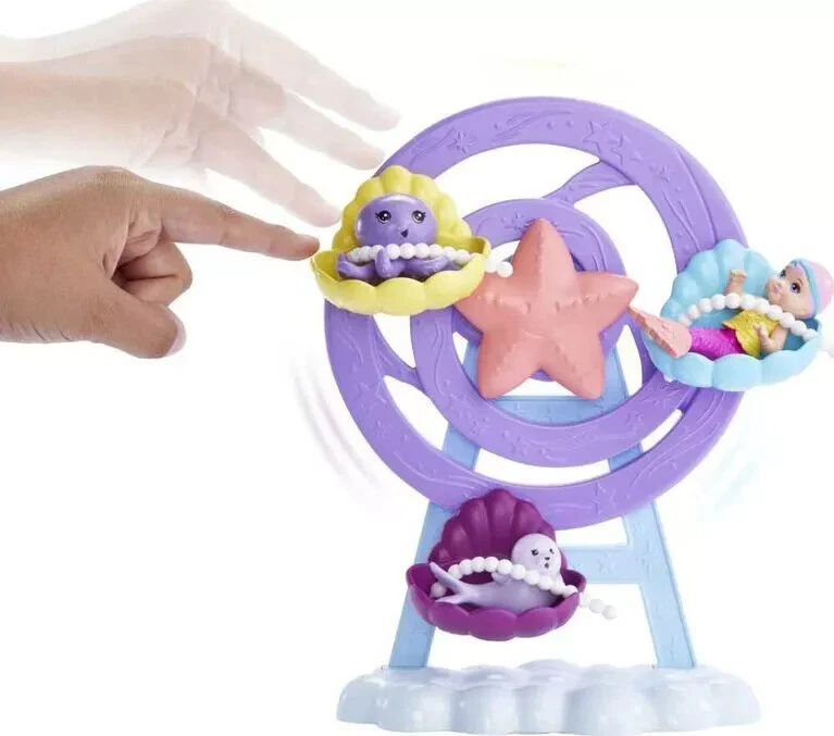 Help Barbie doll care for a merbaby, baby seal and baby octopus in this fantasy set that puts a magical twist on classic nurturing play The mermaid has lavender fantasy hair and a beautifully sculpted pastel pink tail with purple fins. She wears a bright yellow bodice and a ruffled overlay at her hips! The nautical, Ferris wheel-inspired bed has three shell cribs and really spins! Tuck each of the little ones inside with a pearl belt to make sure they stay safe and sound Seat the merbaby on the adorable seahorse rocker for a fun activity! Its gentle swaying mimics the motion of ocean currents, which is super soothing for a newborn mermaid The included bottle and blanket help encourage nurturing role-play. From swaddling the seal to playing hide and seek with the octopus or feeding the merbaby, there are so many story possibilities! 3+ years Brand new in sealed box; box has slight shelf wear From a smoke-free home Returns accepted if I missed a flaw or made a mistake and I will pay the return shipping. Otherwise return shipping is at buyer's expense. I am happy to combine and reduce shipping on all items if possible. I ship within 2 business days.