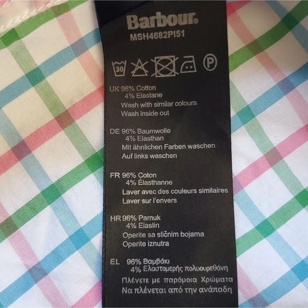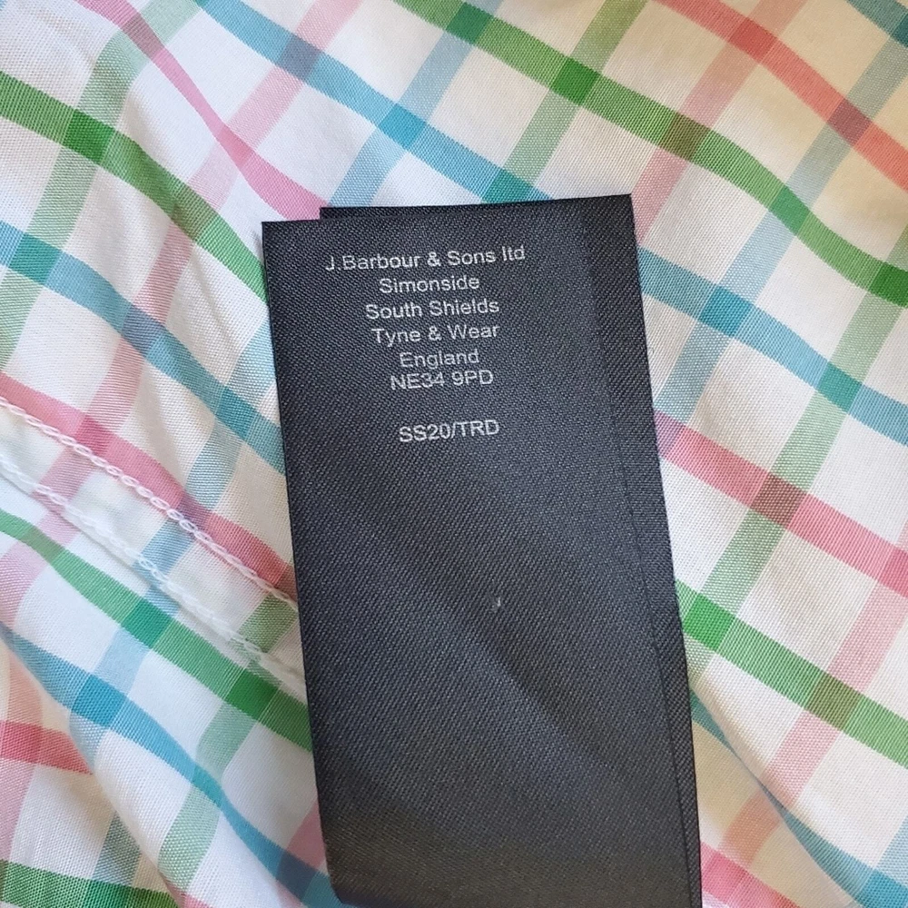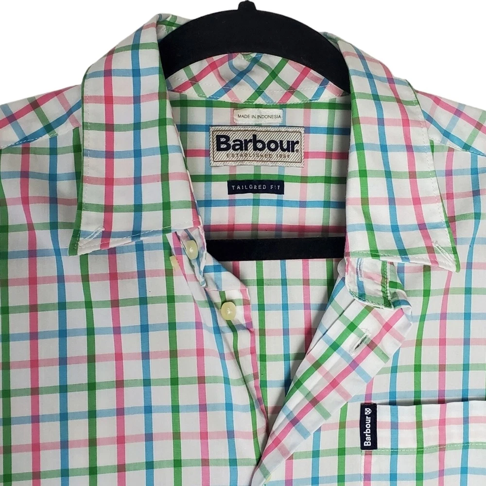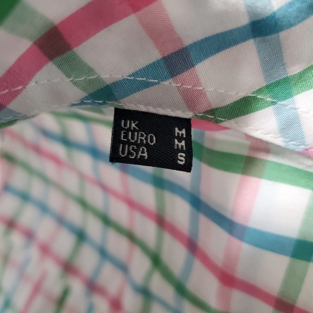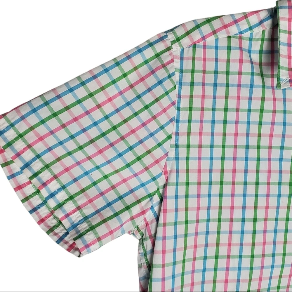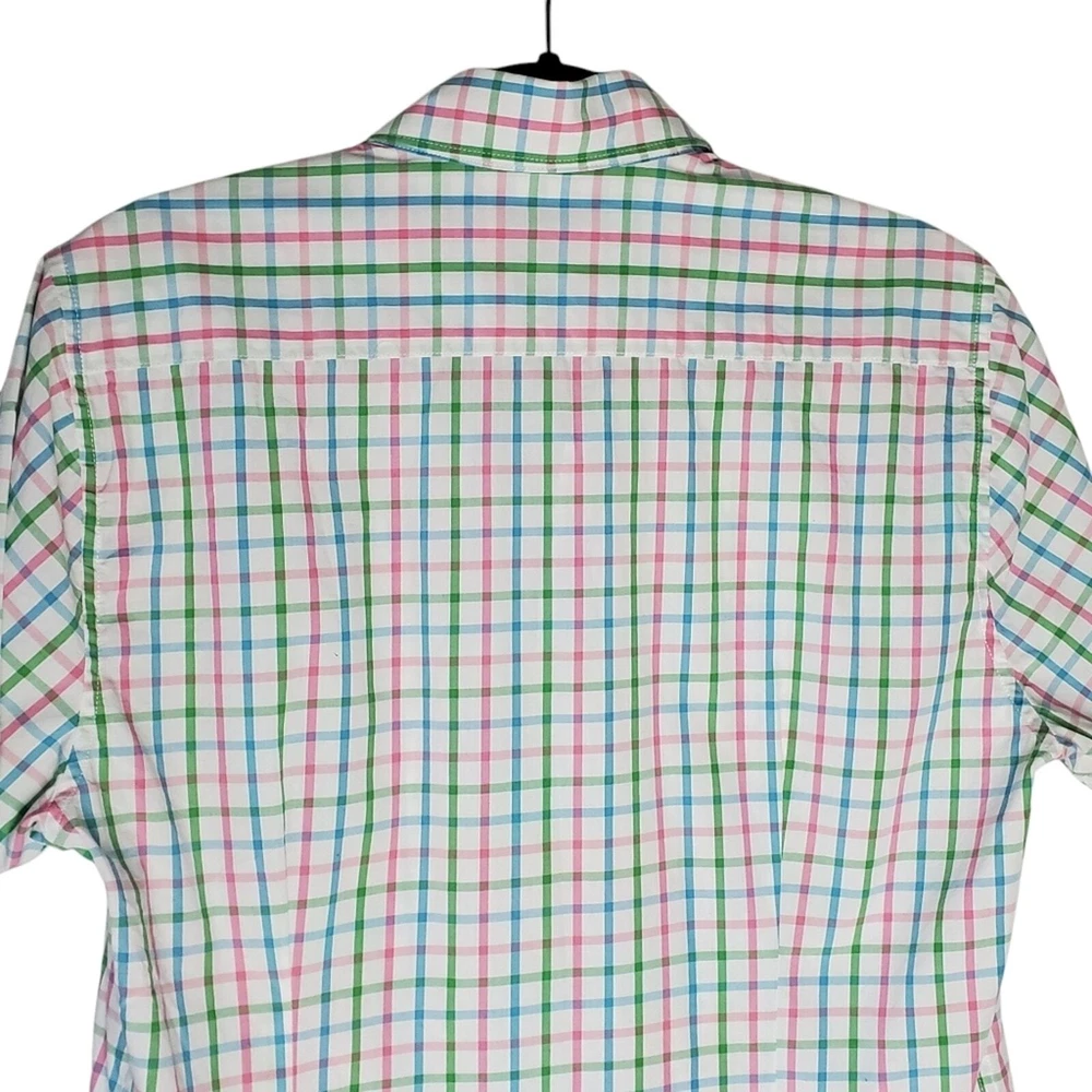 Excellent condition, gently worn Button down Short sleeve Chest Pocket Round hem Color white checkered blue, green, pink Pit to Pit 19" Front Length 28.5" back length 30" Size S