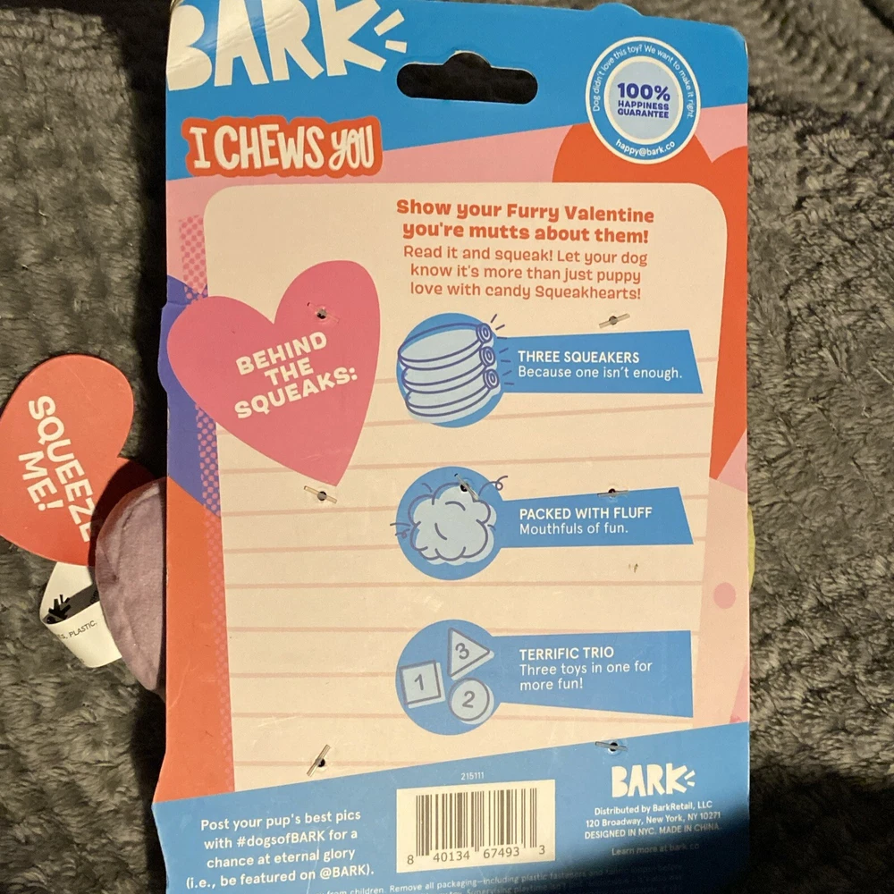 The BARK Box 3 pcs Squeaky Hearts Dog Toy is a perfect Valentine's Day gift for small to medium-sized dogs. This chew toy set includes three conversation heart-shaped toys with a squeaky feature, providing entertainment and stimulation for your furry friend. The toys are designed for regular use and are ideal for dogs who enjoy interactive play. The cute design and squeaky feature make this set a fun addition to your dog's toy collection, allowing them to have a playful and engaging experience.